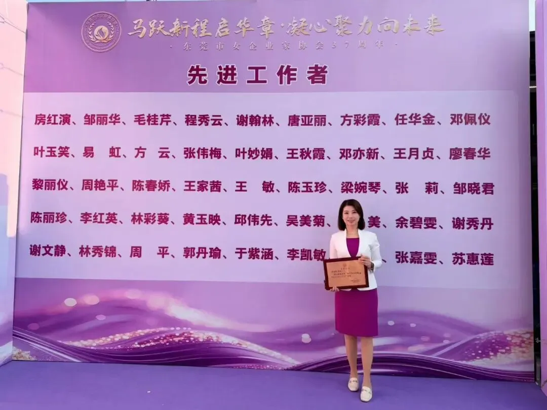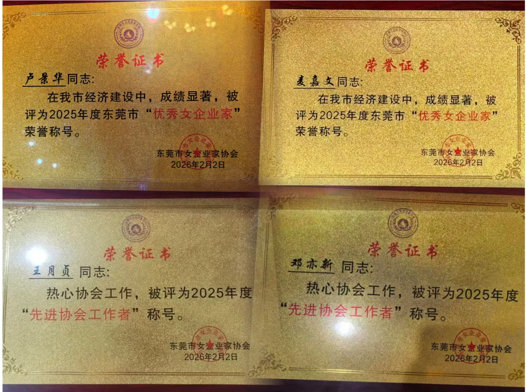 同时,我会会员麦嘉文、卢景华荣获"2025年优秀女企业家"称号,以表彰其在各自企业经营发展中所取得的杰出成就;邓亦新、王月贞荣获"2025年先进协会工作者"称号,以表彰其在协会日常运营及活动组织中的辛勤付出与突出贡献。我会将以此次获奖为新的起点,继续秉承"团结、创新、奉献、发展"的宗旨,进一步加强协会建设,提升服务能级,为会员企业搭建更为广阔的交流合作平台,为东莞市经济高质量发展持续贡献巾帼力量。