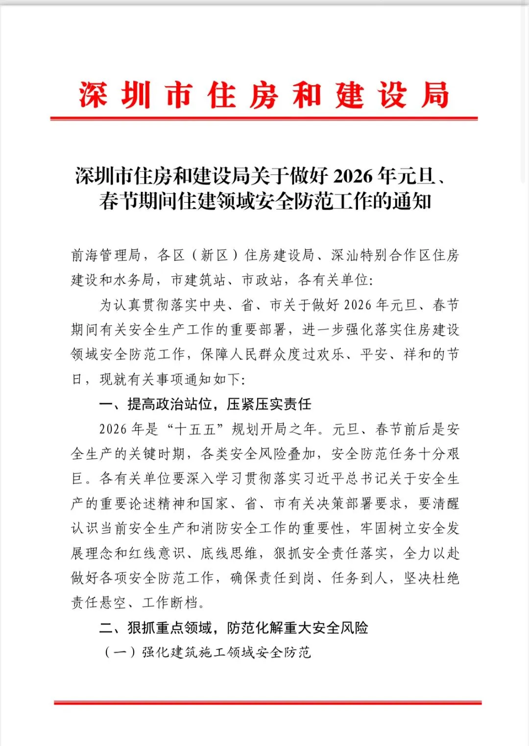 深圳住建局关于2026年元旦春节期间住建领域安全防控工作的通知