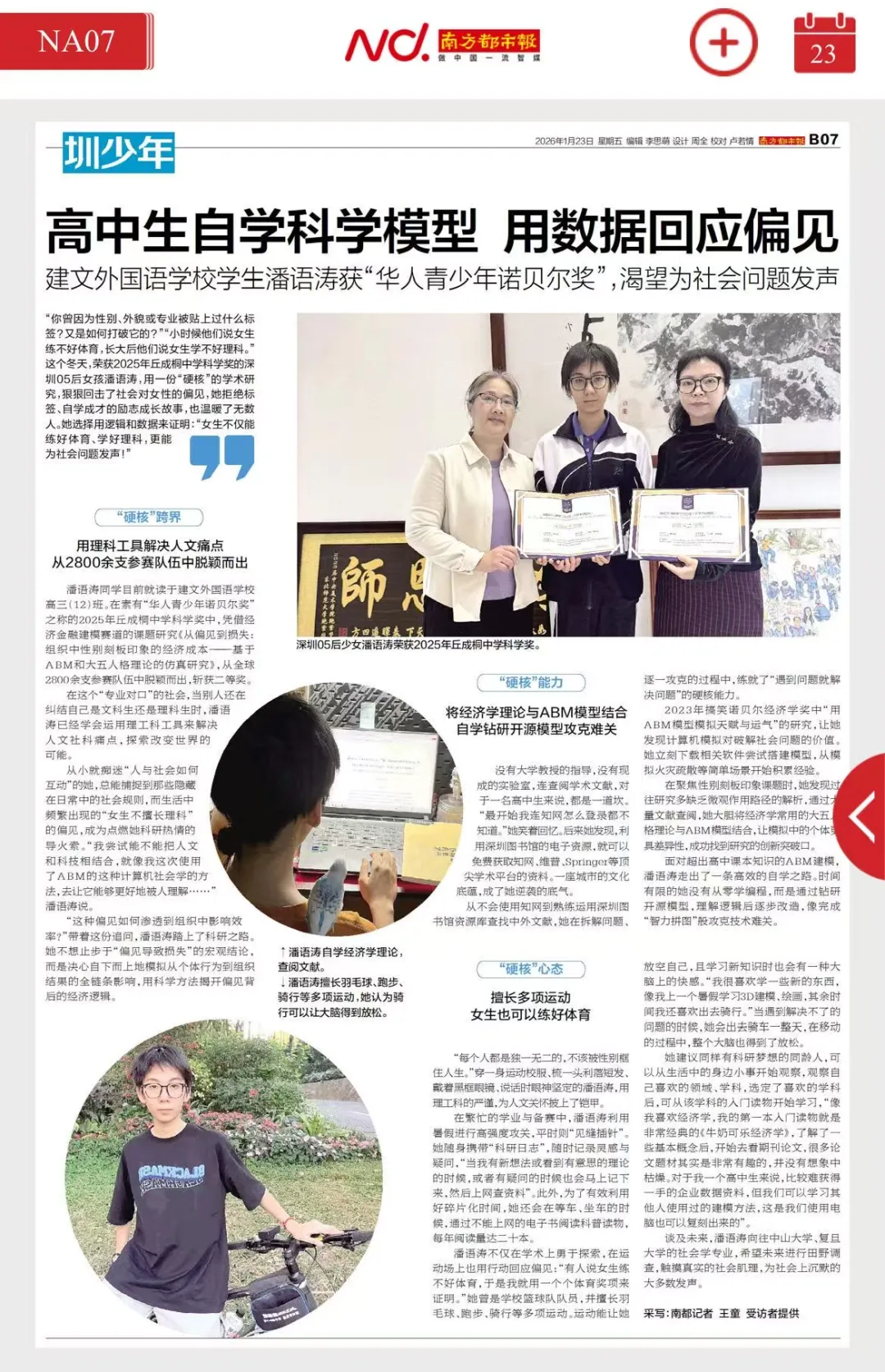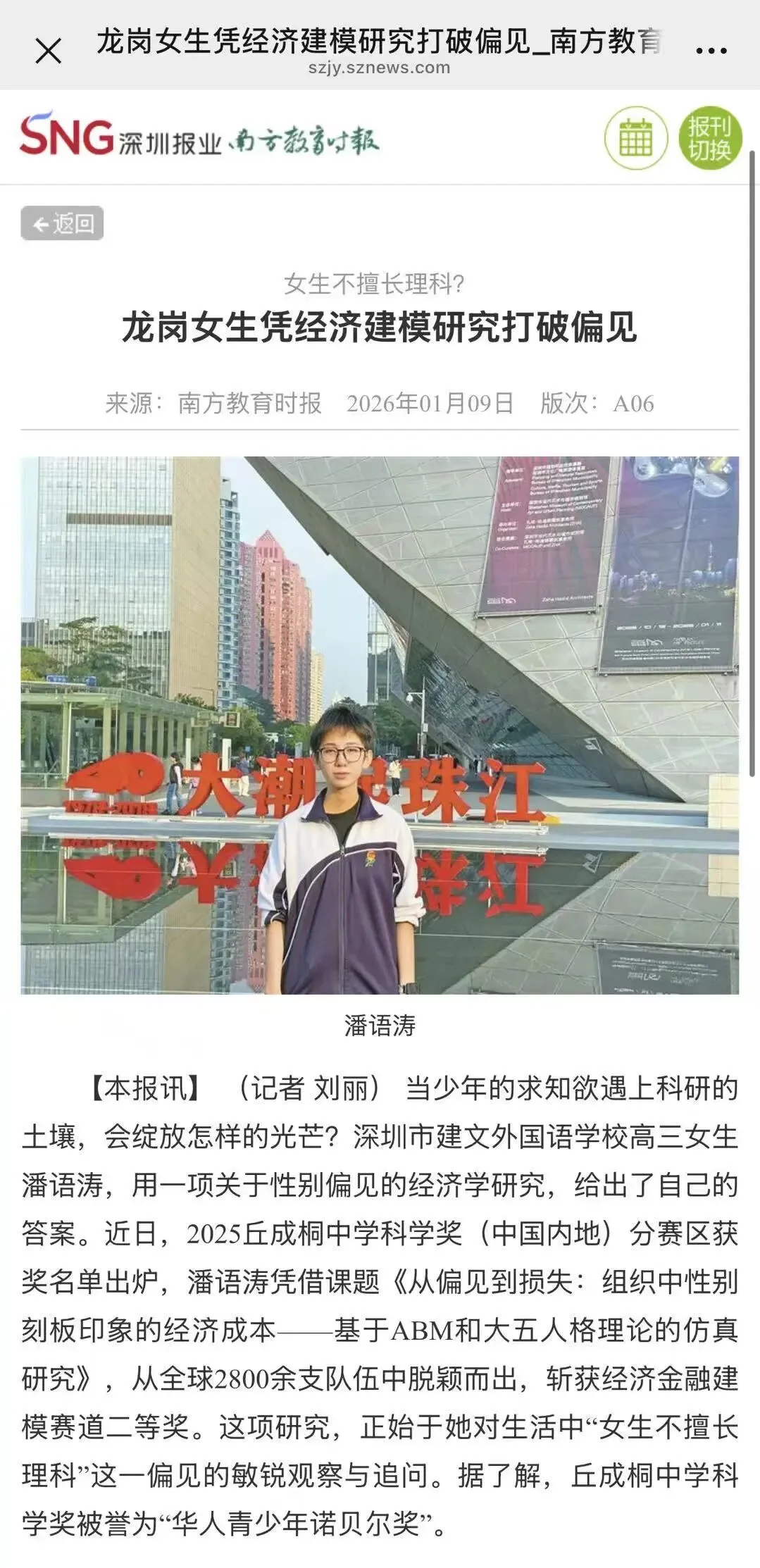 在被誉为“中国青年诺贝尔奖”的2025年丘成桐中学科学奖中国赛区总决赛中,高三(12)班潘语涛同学凭借课题《从偏见到损失:组织中性别刻板印象的经济成本——基于大五人格理论的ABM模拟研究》,荣获“经济金融建模”赛道全国二等奖,创下我校在此项赛事中的最佳成绩。
