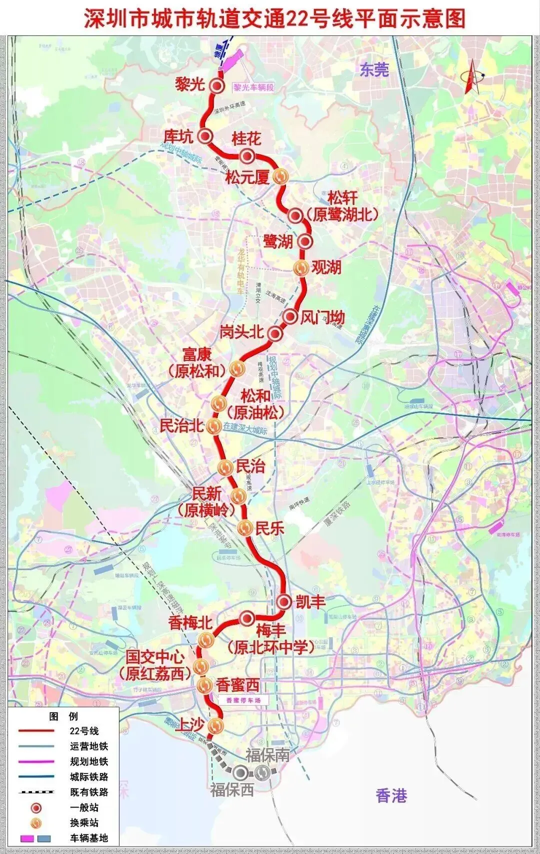 22号线沿线覆盖多个重点片区,自南向北串联上沙、香蜜西、梅丰、凯丰、民新、民乐等关键节点,最终抵达深莞交界的黎光站。在龙华段,线路连接深圳北站枢纽与鹭湖中心城,未来可与4号线、5号线、6号线及深大城际实现换乘,形成多轨交汇格局。黎光站作为终点站,毗邻深莞边界,规划定位为产城融合示范区,未来将依托车辆段上盖开发打造百万平方米级TOD社区。这种设计不仅强化了片区交通效能,更通过站城一体化开发优化土地资源配置,为区域价值提升奠定基础。