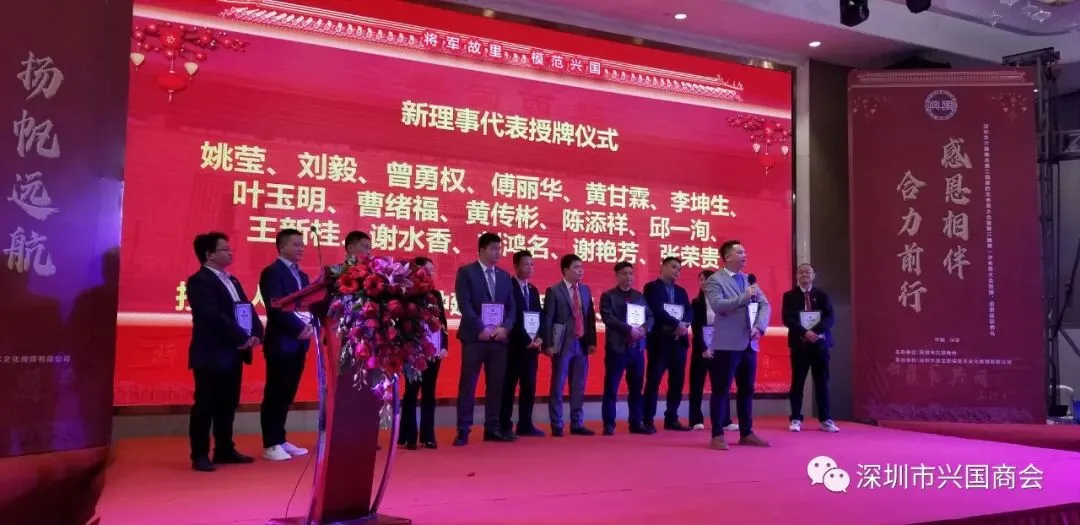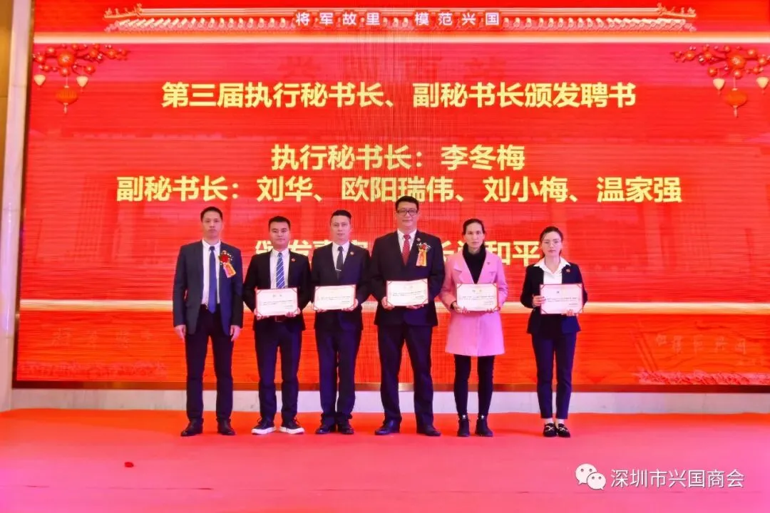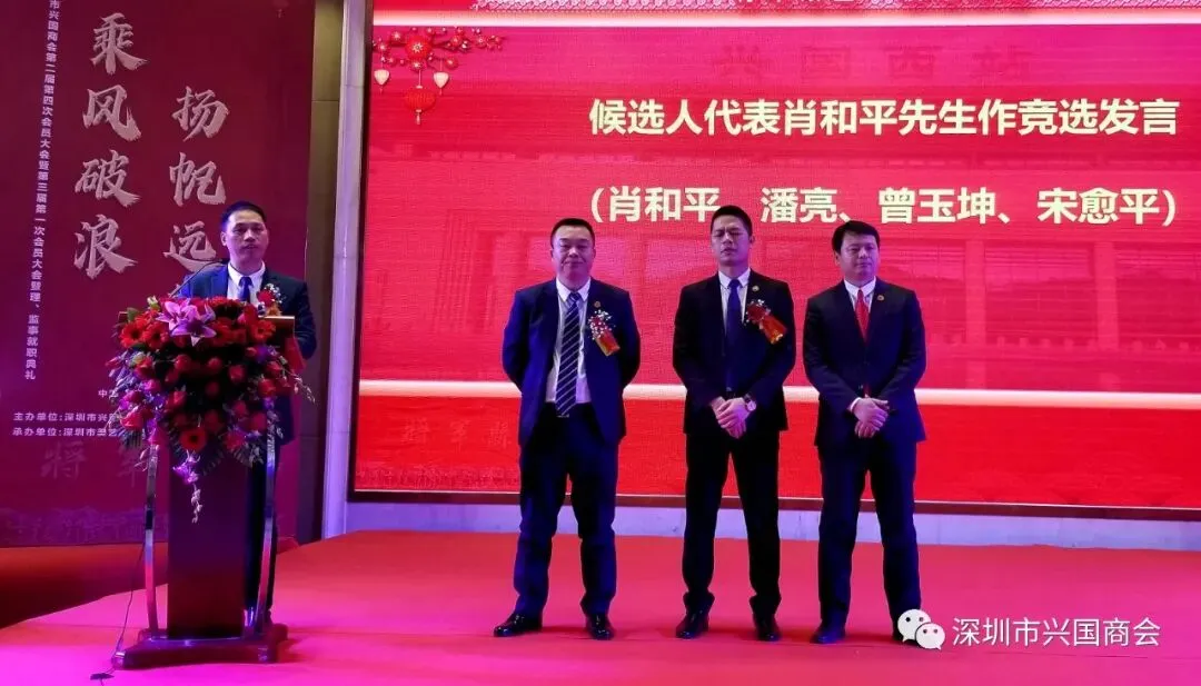 经过会员的推举,郑重选举出第三届深圳市兴国商会理事会成员,肖和平同志被推举为深圳兴国商会第三届会长,潘亮同志被推举为第三届执行会长,大会隆重选举出第三届常务副会长张云朱先生、钟建华先生、罗卿珊先生、钟海华先生、姚声良先生,副会长钟辉红先生、陈河军先生、钟海先生、刘国民先生、谢玉华先生、李思成先生、肖忠慰先生、危先斌先生、廖观银先生,监事长曾玉坤先生。大会聘任宋愈平先生为第三届兴国商会秘书长。主持人宣布选举名单之际,会场响起了热烈的掌声。