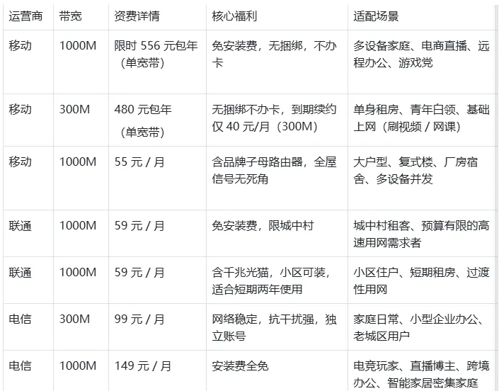 租房党/预算有限:移动1000M 556元包年、联通1000M 59元/月