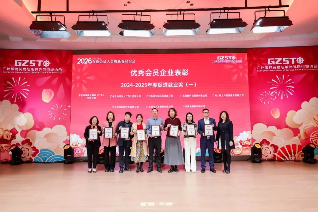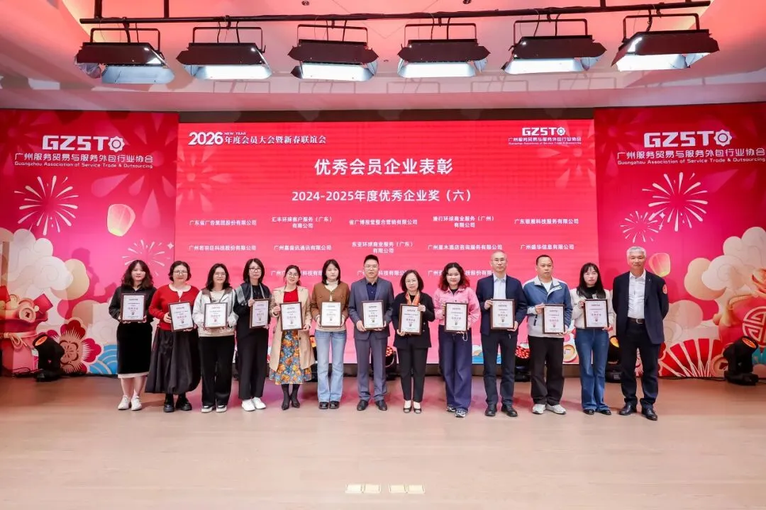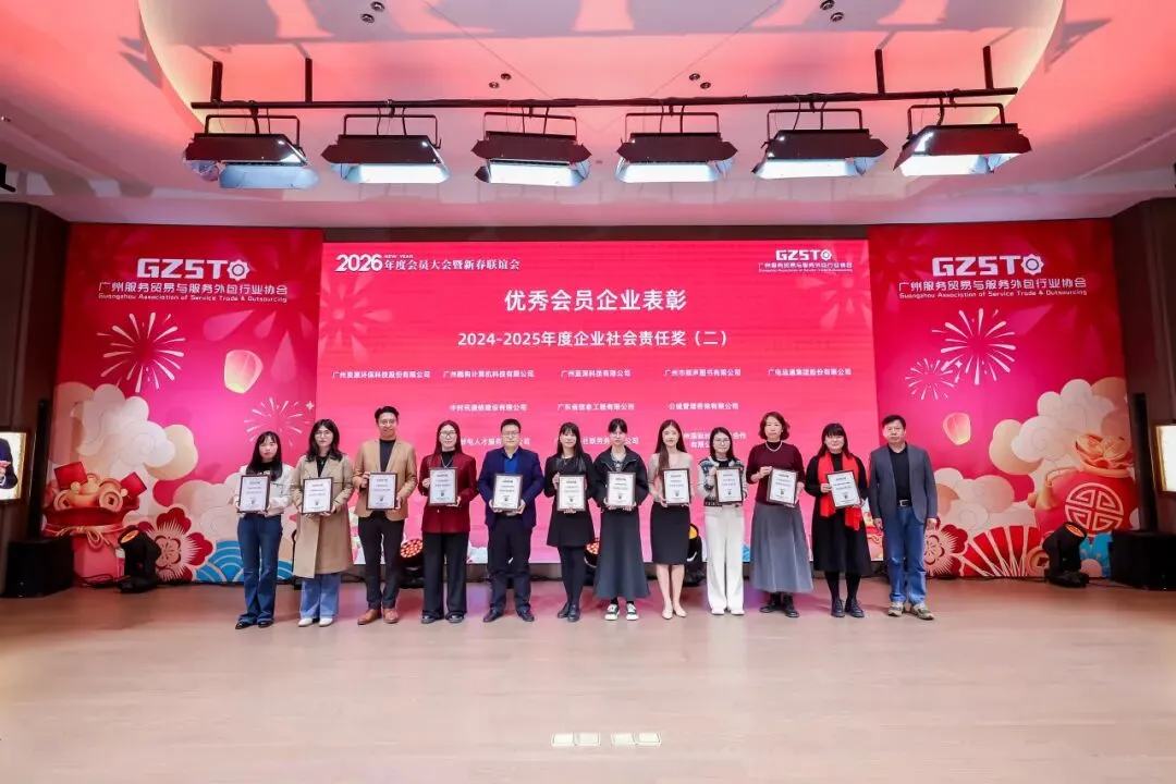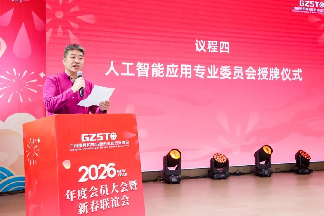 2026年1月30日,广州服务贸易与服务外包行业协会2026 年度会员大会暨新春联谊会在广州举行 ,会议审议了协会2025年度理事会工作报告,表决新增了理事会成员单位,并举行了人工智能应用专业委员会授牌仪式。协会会员代表以及来自业务指导单位广州市商务局、市工业和信息化局、各区商务主管部门的领导,行业资深专家学者、兄弟商协会代表、往届会长及合作伙伴代表等齐聚一堂,共话行业发展新机遇。