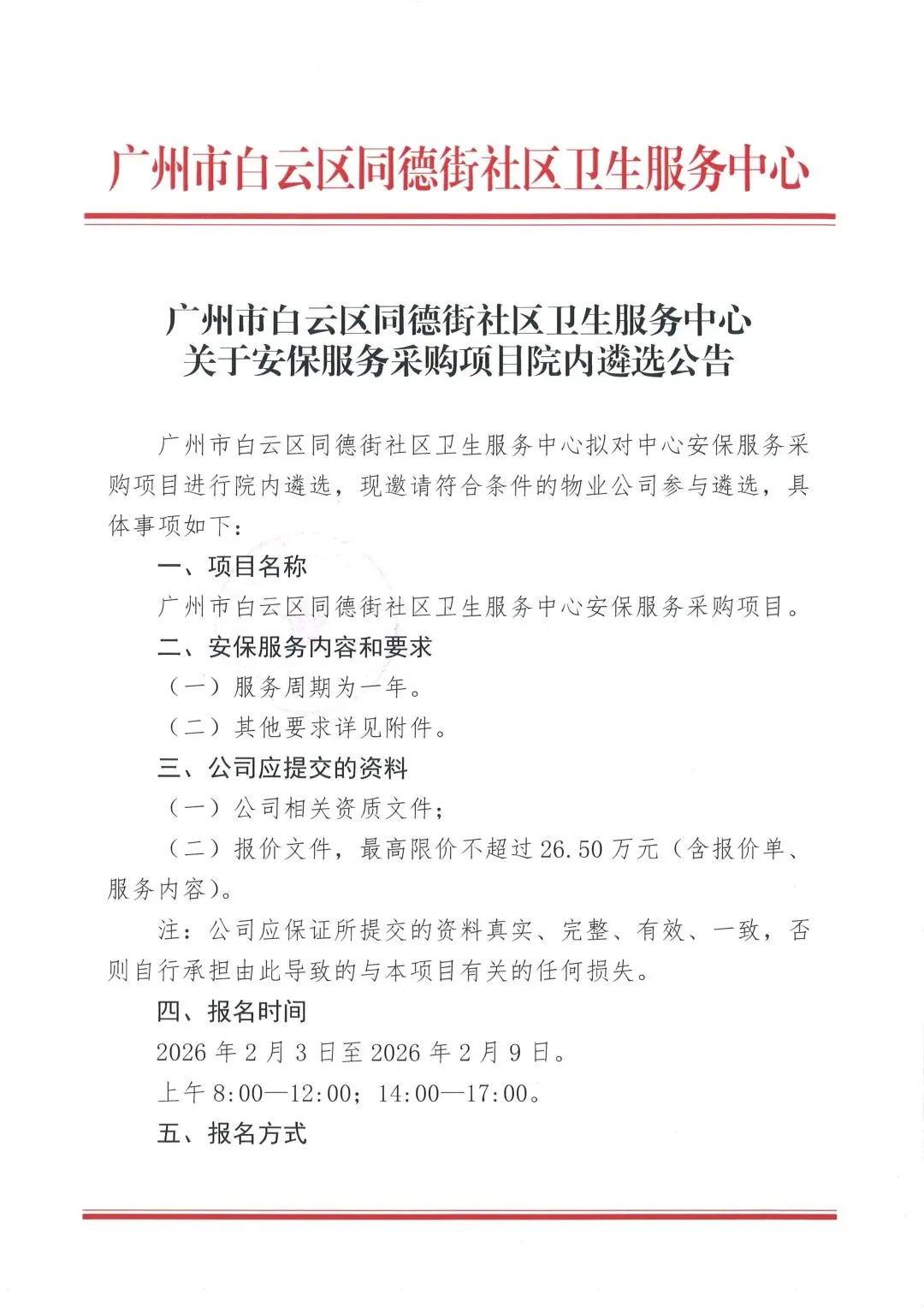>【遴选公告】广州市白云区同德街社区卫生服务中心关于安保服务采购项目院内遴选公告