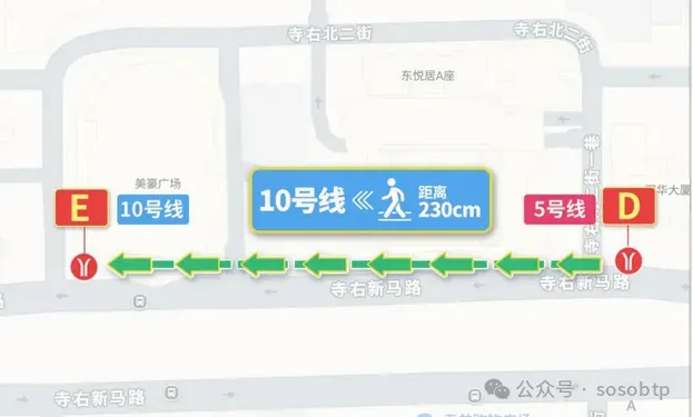 搭乘电梯到达地面后,在地面还需要步行230米,中途需要经过有红绿灯的小段马路。如果在路上担心走错,可以注意沿途的护栏、导向标识柱、柱子等,上面都会有换乘方向的引导标识。提示之间的距离很近,只要走上几步就能看见下一个。