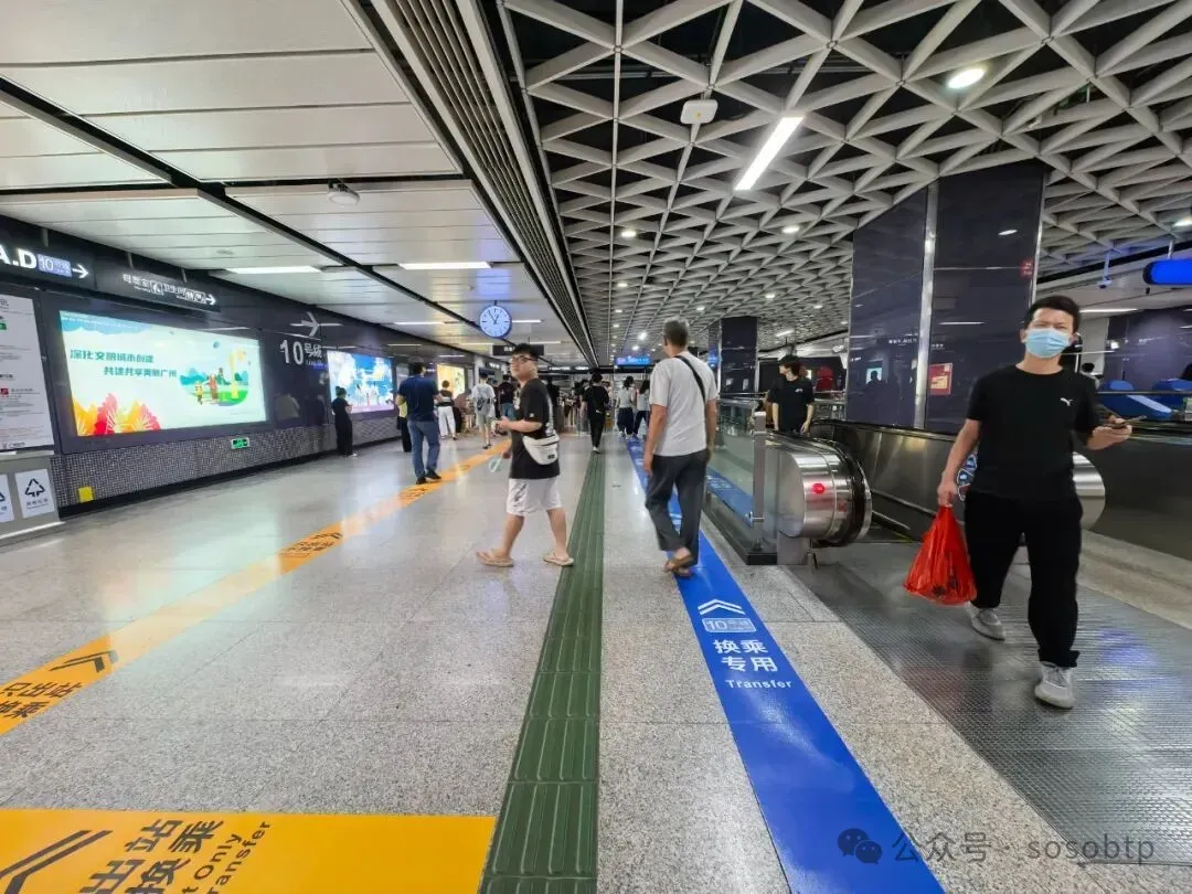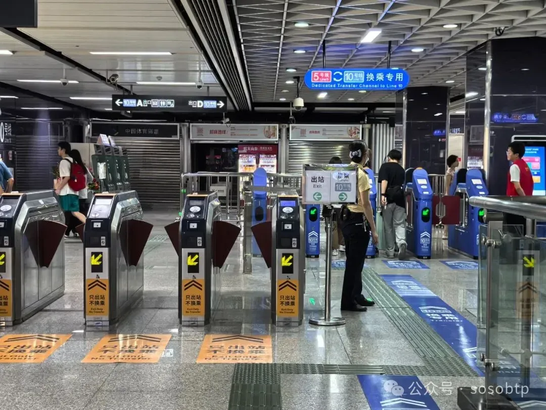 跟着这些引导一直走,就可以找到10号线的地铁口。进站之后再次通过安检,找到蓝色的闸机打卡进入,就能顺利进站了。