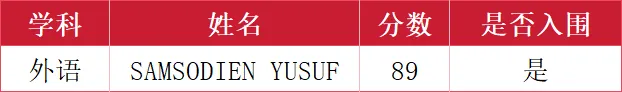 根据《东莞市东城外国语小学公开招聘1名外语教师公告》,经公开报名、资格初审、试讲、答辩等环节,拟聘用SAMSODIEN YUSUF到我校工作,现将成绩予以公示: