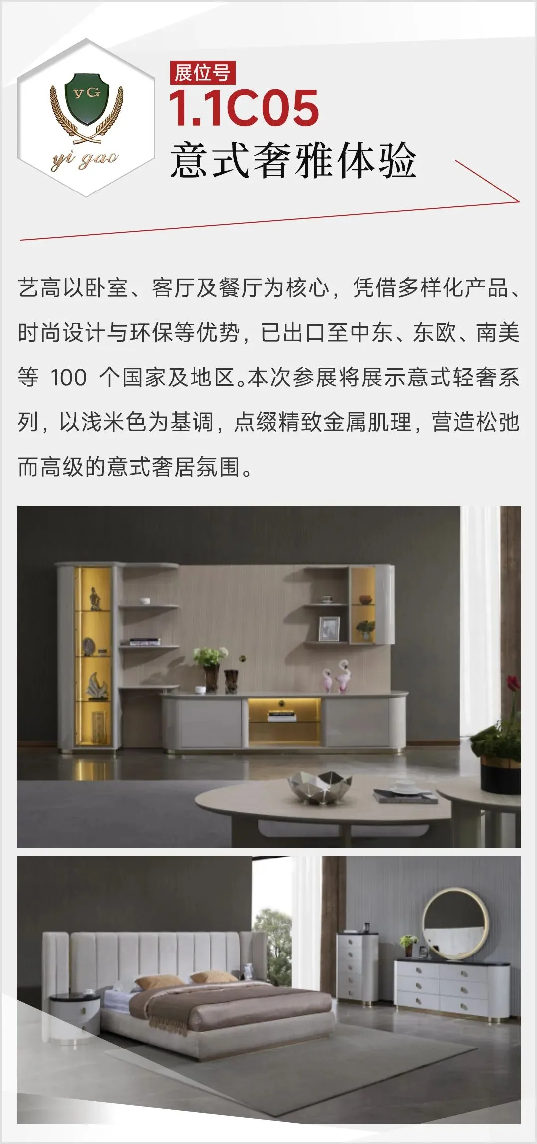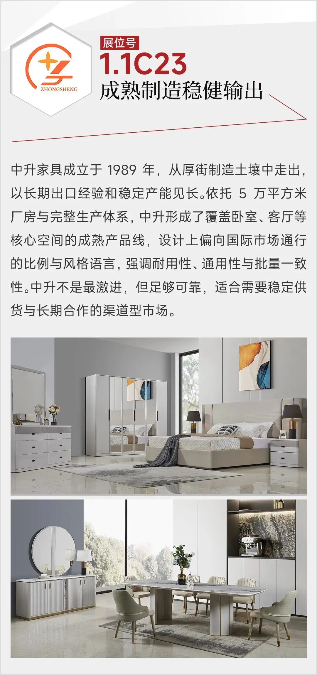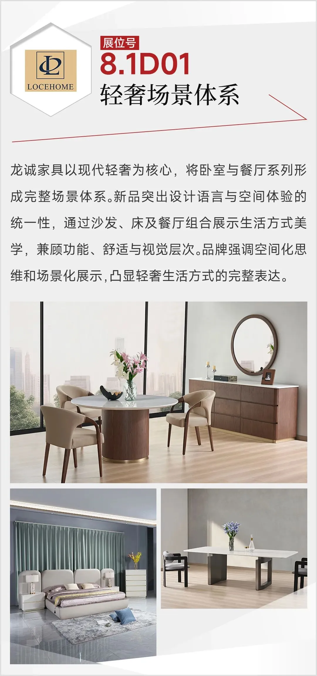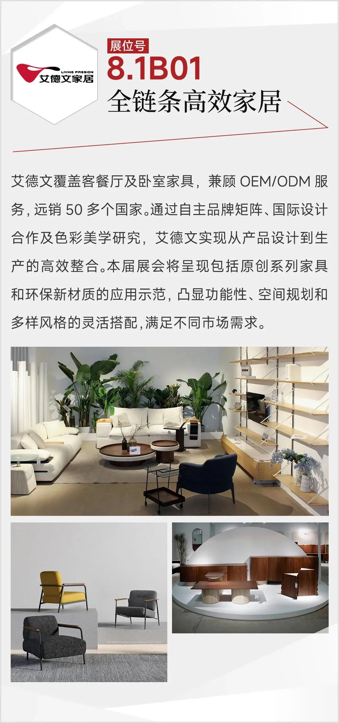 2026年3月,第57届中国家博会(广州)民用家具展,整体家居板块迎来结构性升级:首次由单馆扩展至双馆,布局于1.1馆与8.1馆,展览面积扩大至2万平方米,汇聚来自广东、浙江等地的50家头部企业。主力参展品牌包括黛柏睿、艾德文、欧宜风、艺高、格林、依普瑞森、米高等,其中艾美、圣德领、茵菲莱、因彩、鲁班寐、龙诚等15家品牌首次参展。