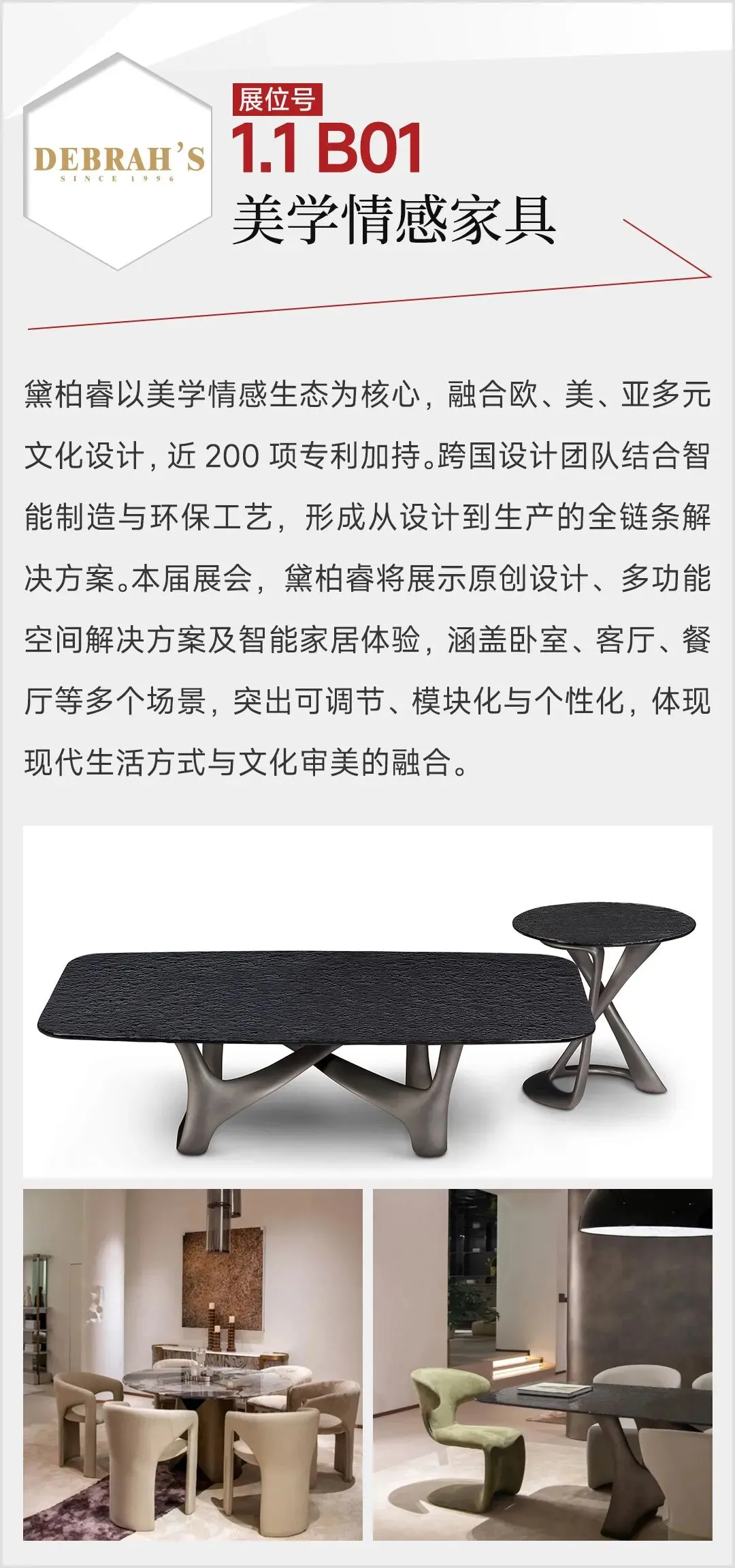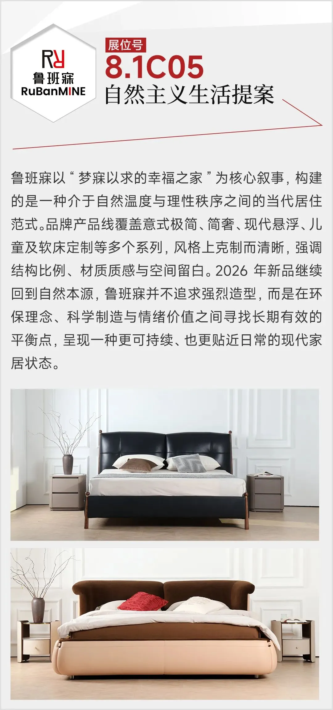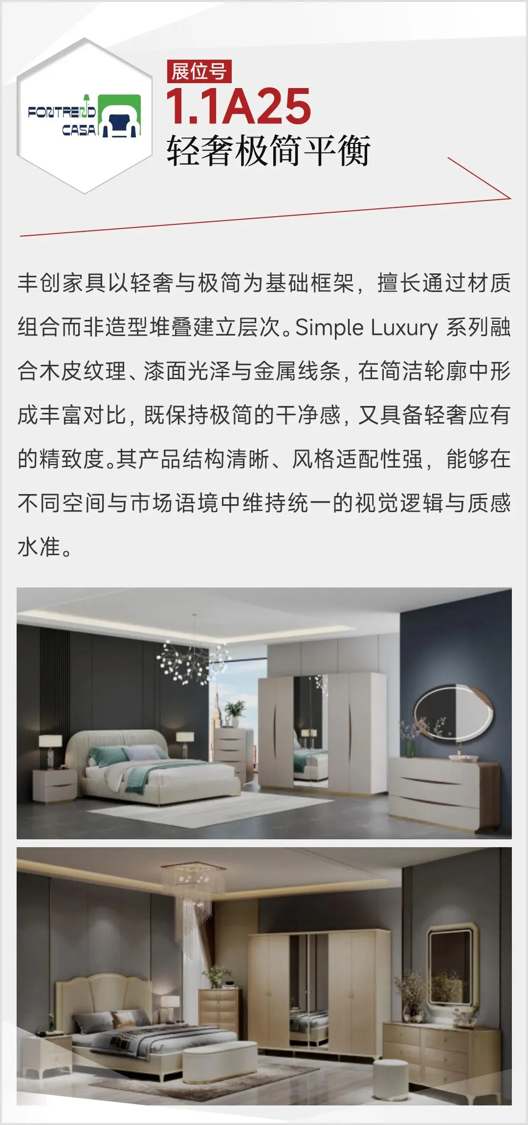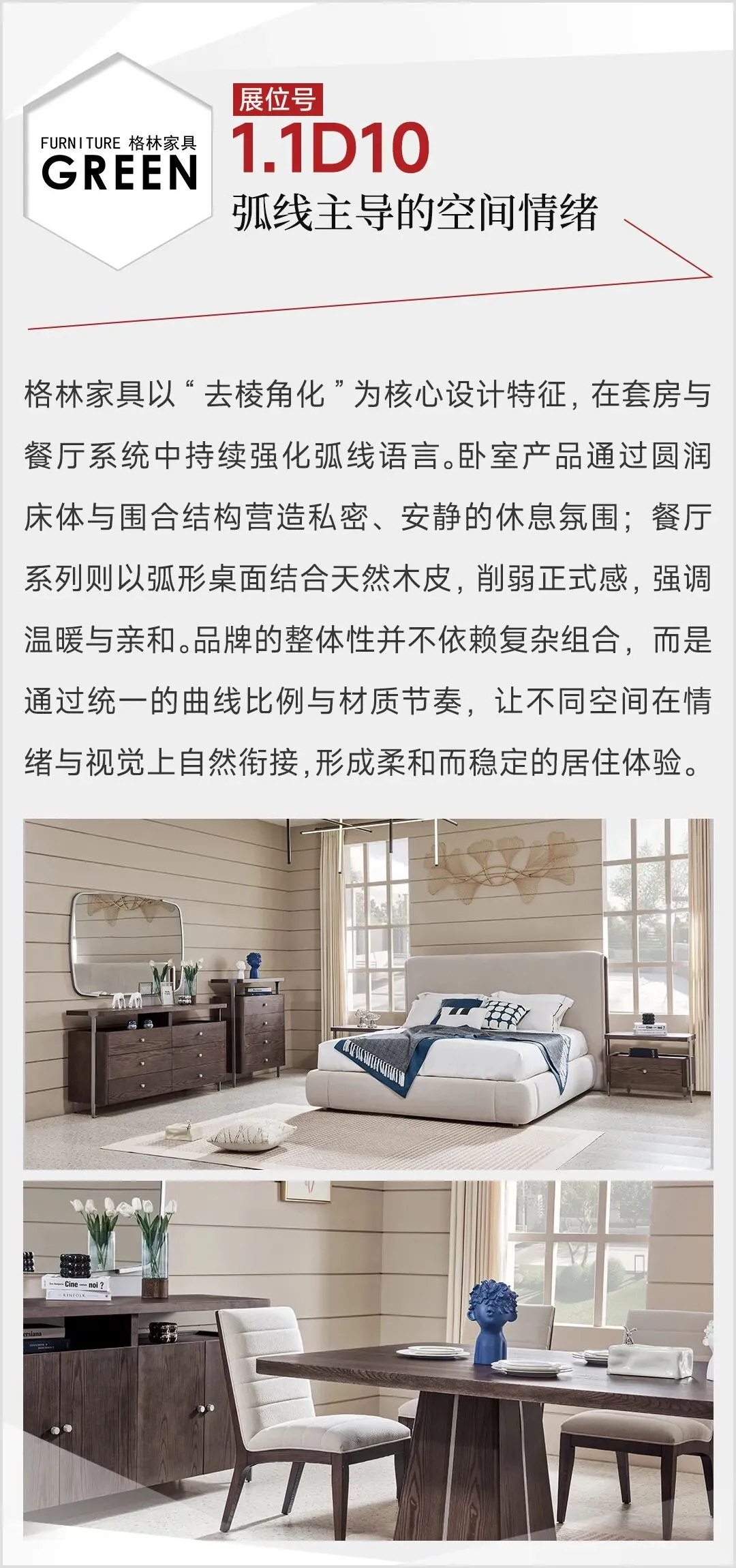 2026年3月,第57届中国家博会(广州)民用家具展,整体家居板块迎来结构性升级:首次由单馆扩展至双馆,布局于1.1馆与8.1馆,展览面积扩大至2万平方米,汇聚来自广东、浙江等地的50家头部企业。主力参展品牌包括黛柏睿、艾德文、欧宜风、艺高、格林、依普瑞森、米高等,其中艾美、圣德领、茵菲莱、因彩、鲁班寐、龙诚等15家品牌首次参展。