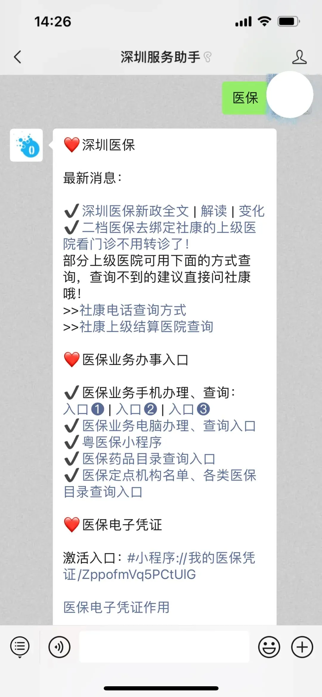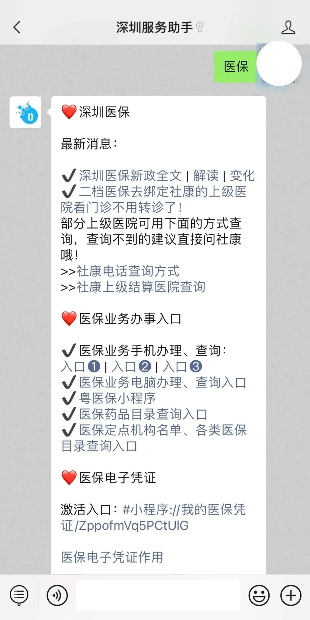 可以点击下方名片【深圳服务助手】公众号,在微信聊天对话框发送【医保】,即可获取入口(查询办理都是同一入口)
