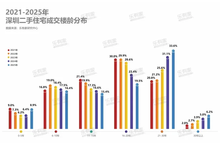 数据显示,在去年二手房成交中,深圳楼龄21-30年的老破小,占比33%,若是16-30年,占比直接高达53.1%。
