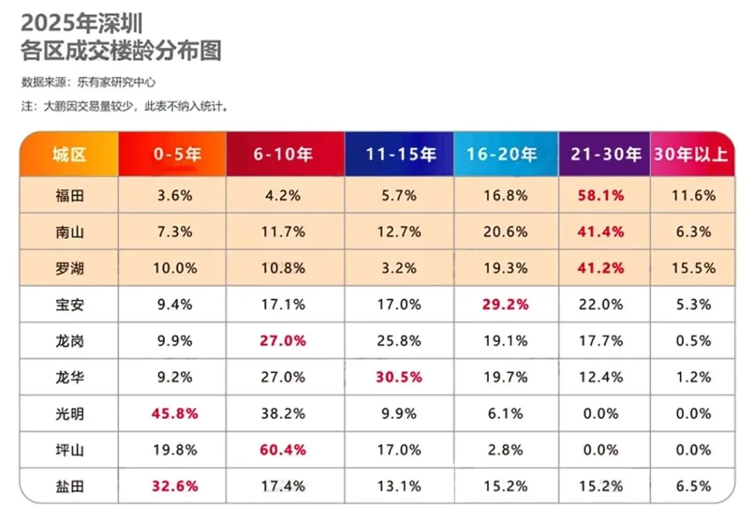 例如福田、南山,楼龄16-30年的二手房成交占比都超过60%,其中福田高达74.9%。