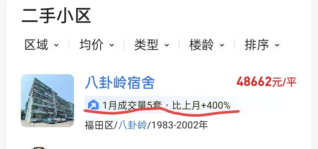福田的八卦岭宿舍,更夸张,43年楼龄硬是成交了85套。这个成交量,直接甩很多次新盘一条街。