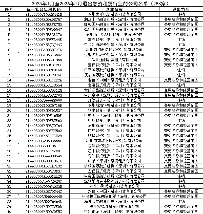 附件:2025年1月至2026年1月退出融资租赁行业的公司名单