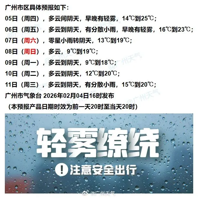广州会受到冷空气波及吗?据广州市气象台预计,2月6日夜间起,受中等强度冷空气影响,零星小雨转多云,气温再次下降。2月9日最低温度为9℃。