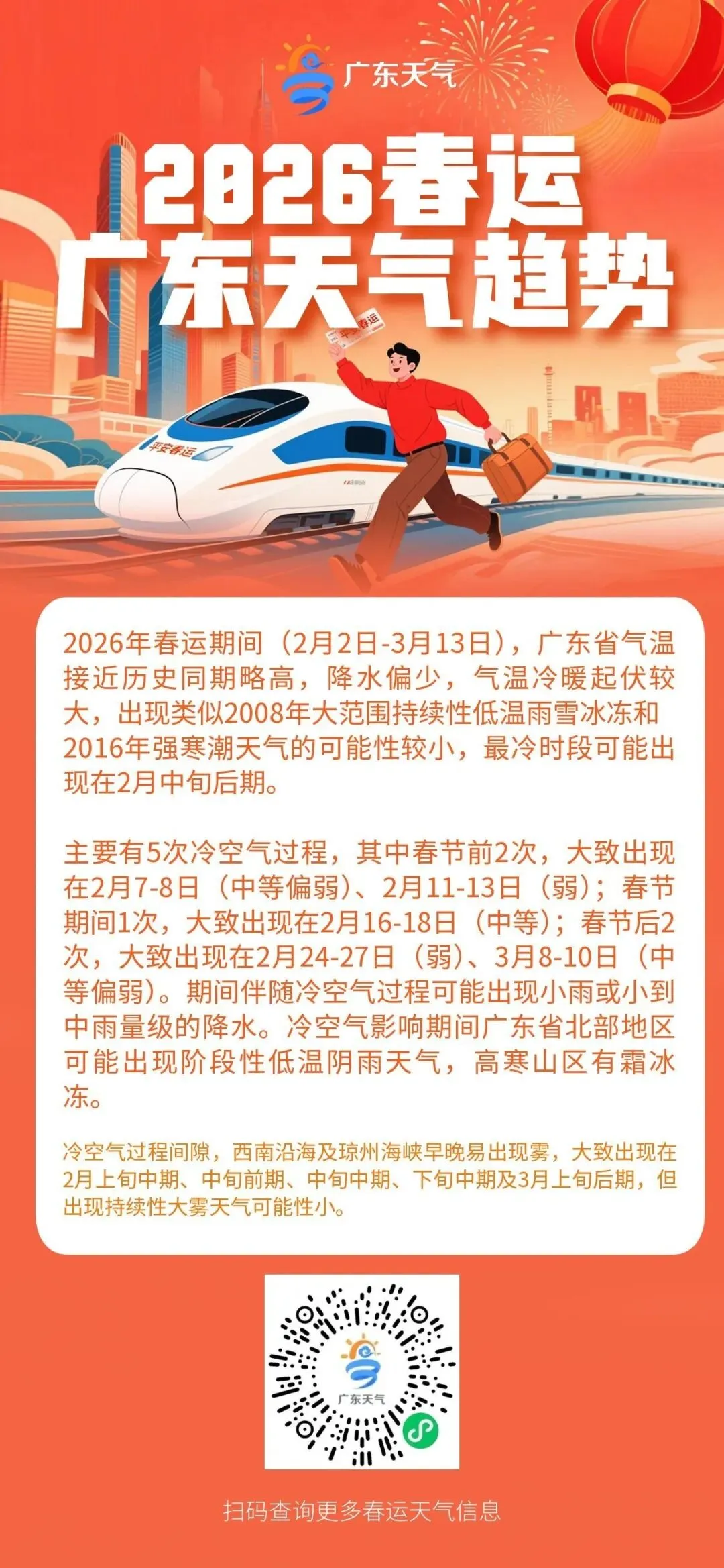 广东省气象台预计,2026年春运期间全省气温接近历史同期略高,降水偏少,主要有5次冷空气过程。
