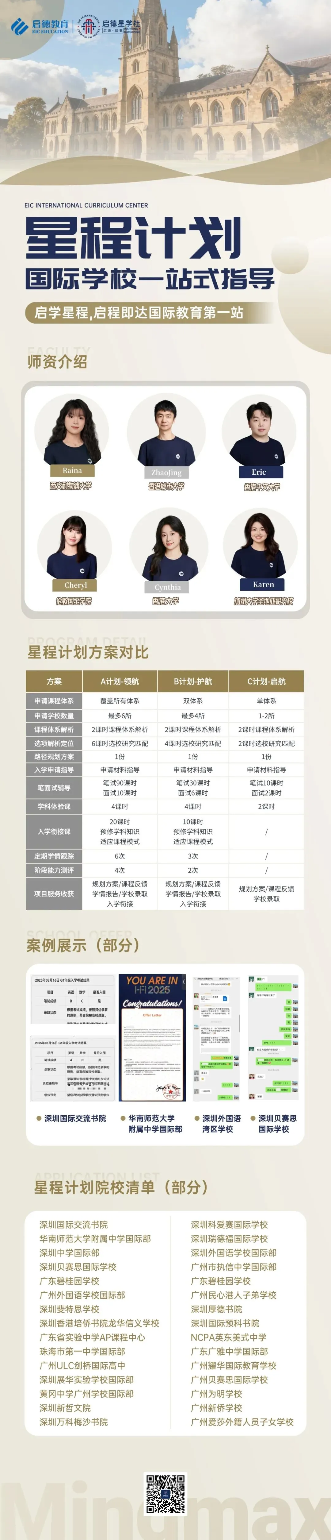星程计划,无论是从选校规划到入学衔接的全程深度定制与辅导,还是课程体系与选校规划专业解析、笔面试能力提升及申请指导等,我们以全方位护航助力学子顺利踏入理想院校,启程即达国际教育第一站。