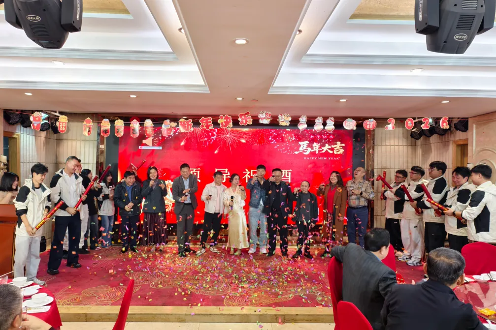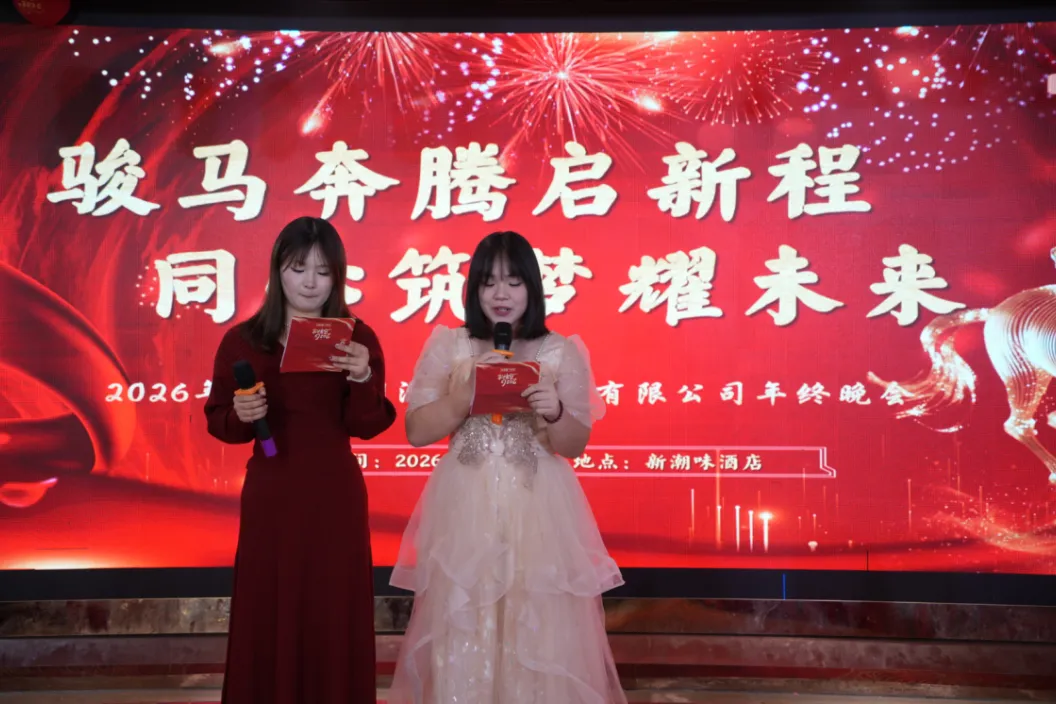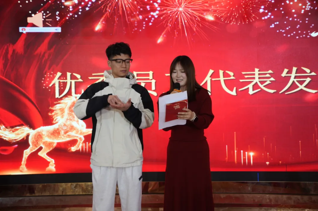 随着激昂的音乐响起,灯光聚焦舞台,主持人苏美彤、韩思齐携手手语翻译尚宇闪亮登场,正式拉开了年会的帷幕!“金蛇辞旧岁,骏马迎新春!” 一句真挚的问候,瞬间点燃了全场氛围。