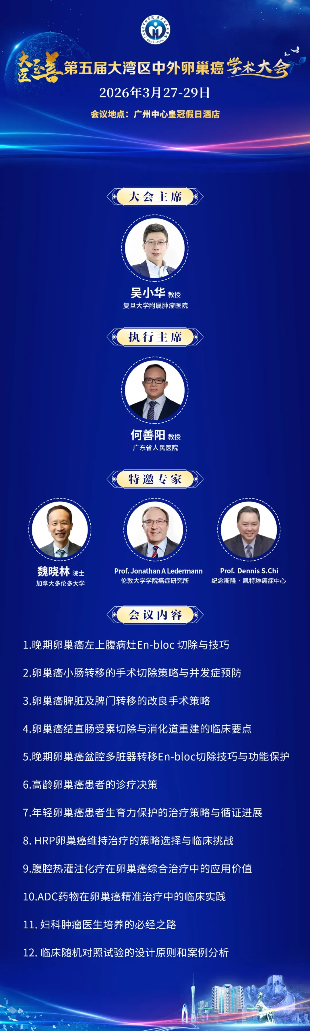 大医至善第五届大湾区中外卵巢癌学术会议预计将于2026年3月27至29日在广州举办,特邀国内外多名院士及顶级卵巢癌专家,齐聚羊城,论剑卵巢癌。会议内容丰富,精彩纷呈!包括3D腹腔镜下早期卵巢癌全面分期术、经腹初始晚期卵巢癌减灭术(含盆腔 En-bloc 整块切除、卵巢癌肝门淋巴结转移切除及改良脾切除)的手术直播,以及卵巢癌维持治疗、ADC 药物精准治疗、年轻患者生育力保护等前沿诊治方案的最新研究进展研讨,同时还会深度剖析多器官 R0 手术的难点,并配上精彩手术视频的详细讲解!