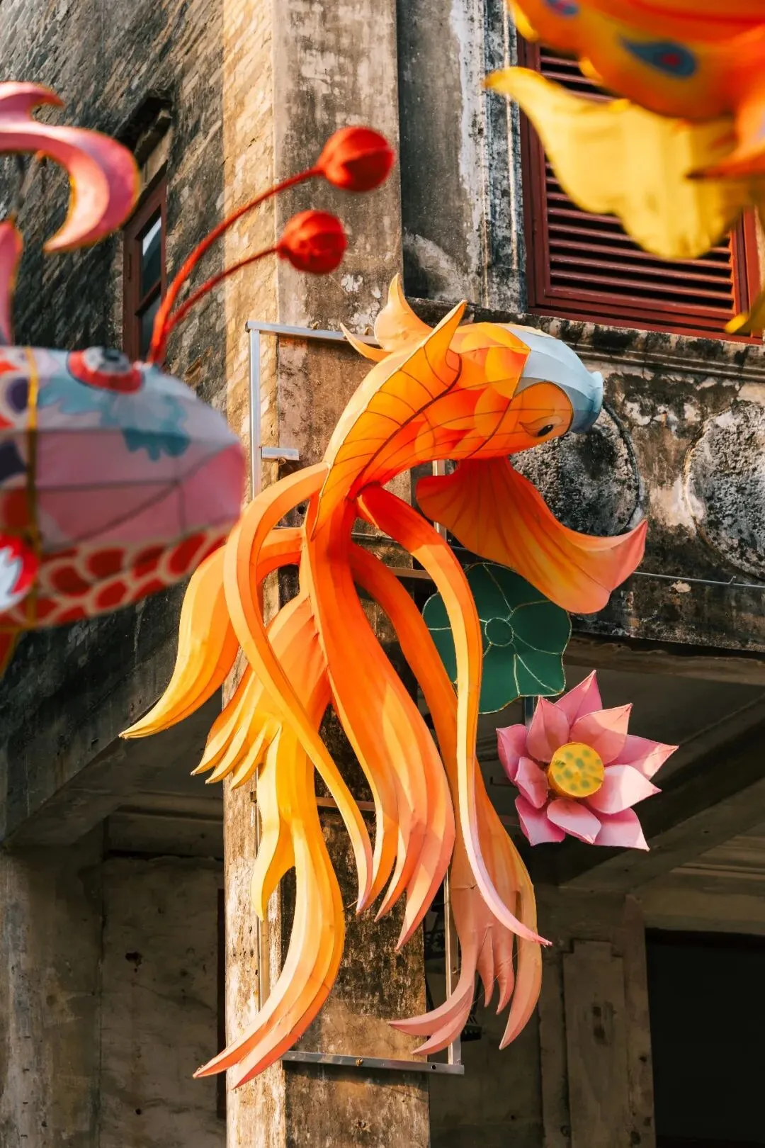特邀香港扎作团队扎制的花牌今年也没有缺席,孔雀与龙柱展现着流光溢彩的港韵国风,在老式骑楼前送出热闹炫目的祝福。
