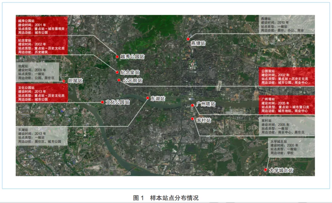 本研究采用多源数据融合的方法进行站点分类与选取。首先,通过无人机拍摄卫星影像以及实地调研,对广州地铁运营站点的设施及周边环境进行系统性普查。然后,根据站点区位、周边城市要素,将站点划分为重点站和一般站。其中,重点站指周边城市风貌具有代表性的站点,多数分布于中心城区内,根据周边主导功能类型,可细分为历史文化类、城市景观类、城市窗口类站点;一般站指临近重点站或者位于城市偏远地区的站点,其主要功能为快速集散通勤人流,地面附属用地范围较小。最后,参考站点区位、类型、建设时期、周边主导功能,选取广州市中心城区及临近区域的5 个重点站(公园前站、越秀公园站、广州塔站、纪念堂站、文化公园站)与 5 个一般站(燕塘站、客村站、东湖站、坦尾站、大学城北站)作为样本站点(图 1)。