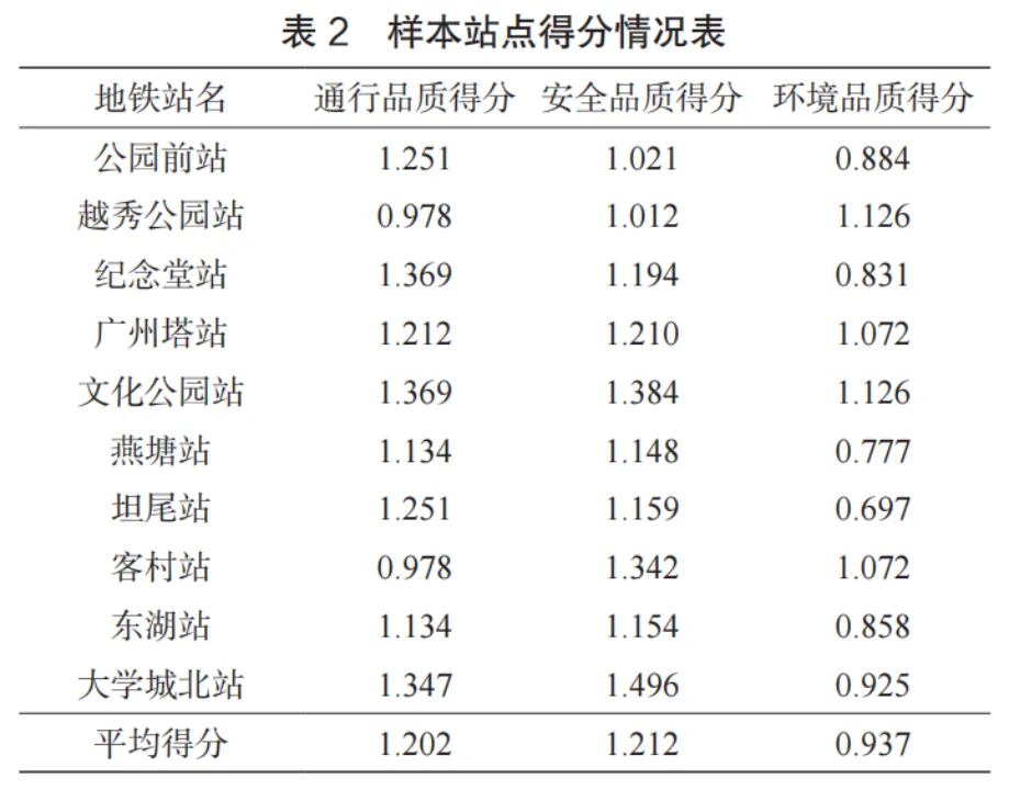 表2 展示了各样本站点的得分情况。基于 5 分制评分方法,各准则层的理论满分值分别为:通行品质1.955,安全品质 1.705,环境品质 1.340。将表 2 中各样本站点在各准则层的平均得分与理论满分值对比可知,样本站点在安全品质(平均得分 1.212 / 满分 1.705)方面表现较好,但在通行品质(平均得分 1.202 / 满分1.955)和环境品质(平均得分 0.937 / 满分 1.340)方面仍有明显不足。