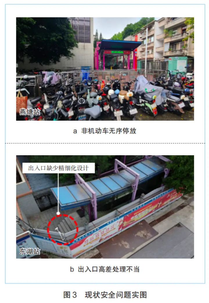 多数样本站点出入口区域存在共享单车无序停放、侵占人行通道并形成视线障碍的现象,增加安全隐患(图3a)。由于缺乏精细化设计理念,部分站点出入口存在高差处理不当、无障碍设施不完善等问题,影响使用安全性(图 3b)。