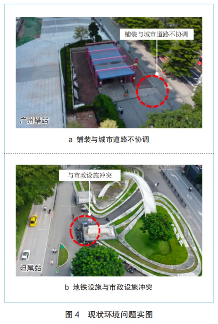 以文化公园站为代表的样本站点通过对出入口及周边环境进行整体设计,整合低效公共空间,有效实现城市消极空间的活化利用。然而,站点与周边环境协调性不足的问题仍然普遍存在,具体表现为:站点周边空间利用率低;站前广场功能单一化;铺装设计与红线外城市道路铺装缺乏衔接(图4a);部分站点出入口与环境融合度较低,附属设施外形突兀,对城市风貌造成破坏;部分站点附属设施与周边建筑、市政设施间距过小,与城市公园红线存在冲突(图 4b)。