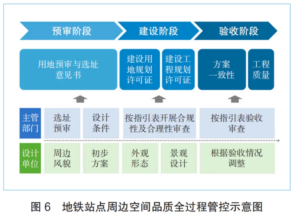 针对新建线路站点,建立从预审选址到建设验收的管控体系,明确各阶段主管部门与设计单位的职责分工,通过全过程管控,切实提升地铁站点周边空间品质(图6)。预审选址阶段,对地铁站点选址开展系统性评估,为设施建设确定明确的规划要求与设计条件。建设阶段,设计单位需依据前期确定的规划要求与设计条件,完成项目外观形态与景观空间的整体方案设计;主管部门同步运用指引表对报建项目开展合规性审查,确保方案符合一体化设计要求。验收阶段,结合指引表对建成项目进行综合评估,核查设施建设品质及规划设计的整体协调性。