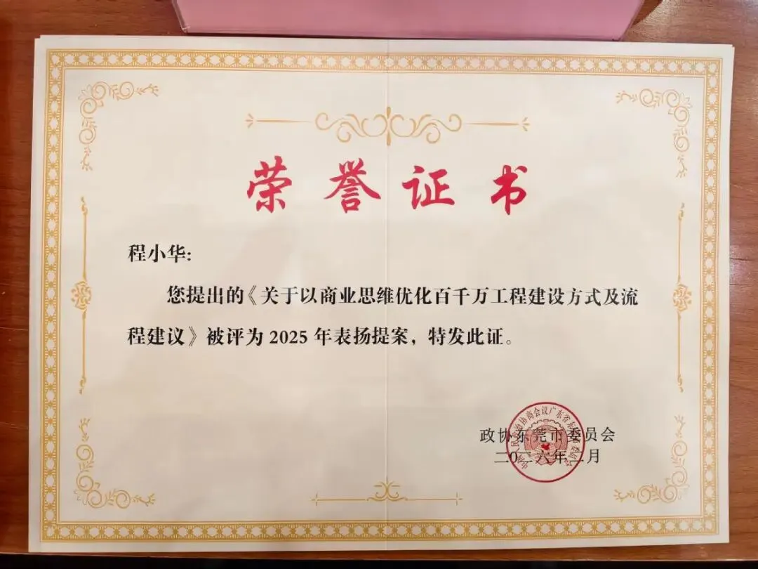 履职有温度,提案有分量。回望2025年,程小华委员的履职足迹扎实而清晰,他联名参与提出的《关于进一步探索商事调解市场化机制,助力我市法治化营商环境建设的建议》获评2025年度优秀提案,《关于以商业思维优化百千万工程建设方式及流程建议》获年度表扬提案。两份沉甸甸的荣誉,既是对其履职成效的高度肯定,也彰显了他聚焦东莞发展重点、紧盯民生关切难点的责任与担当。