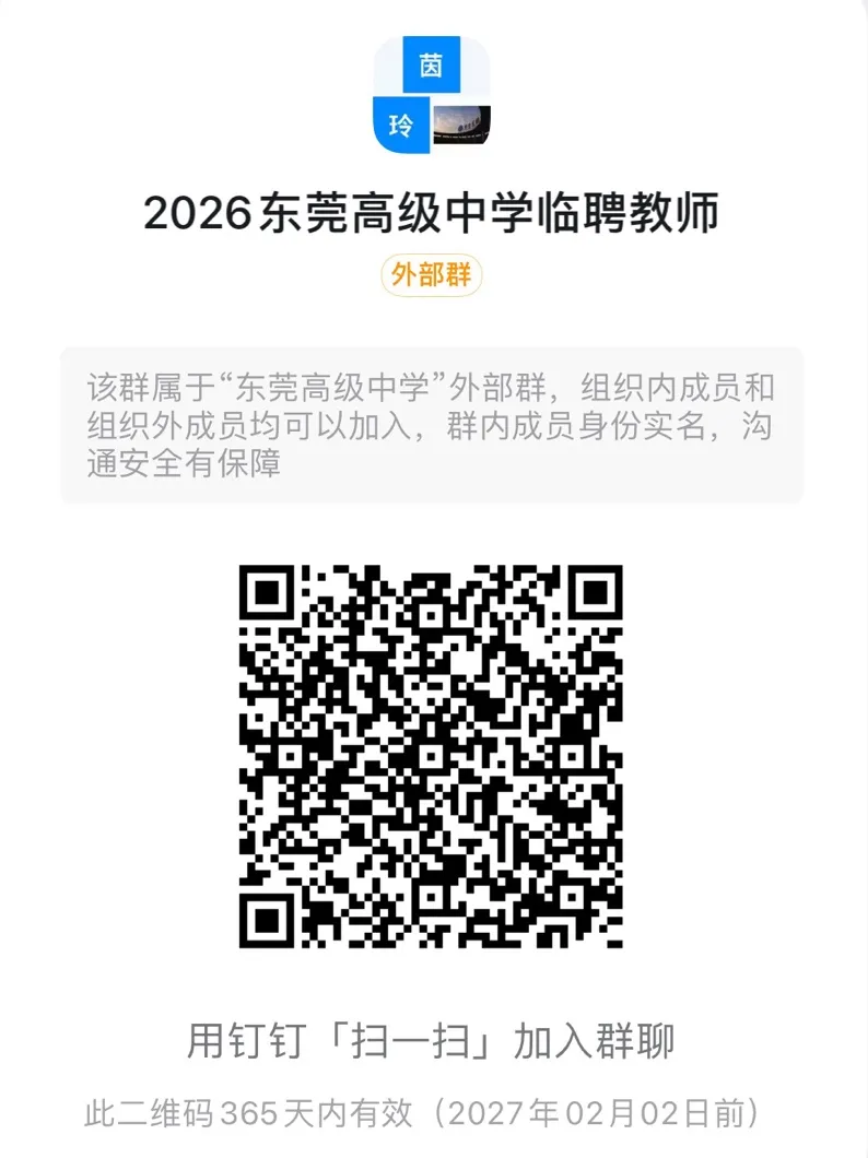 报名考生请加入2026东莞高级中学临聘教师钉钉群(群号:151055024107)或钉钉扫描以下二维码加入,进群后改名:学科 姓名。