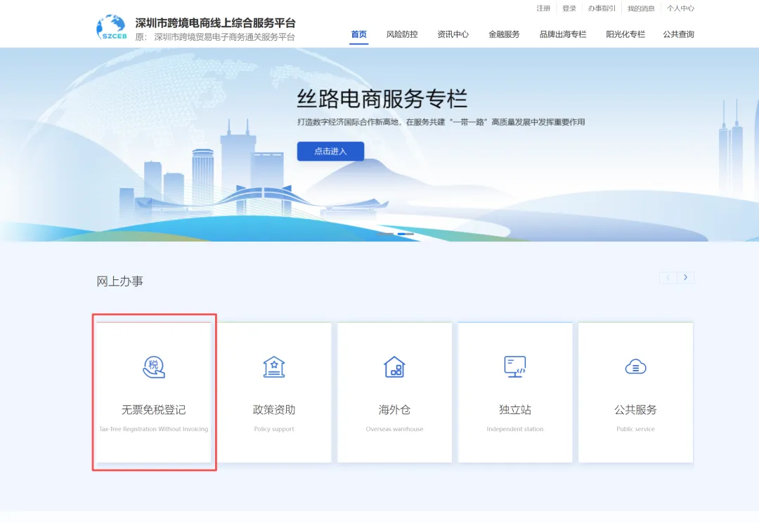 1️⃣ 卖家需访问深圳市跨境电商线上综合服务平台,点击“无票免税登记”模块以进入登记界面。(深圳市跨境电商线上综合服务平台网址:https://www.szceb.cn/)