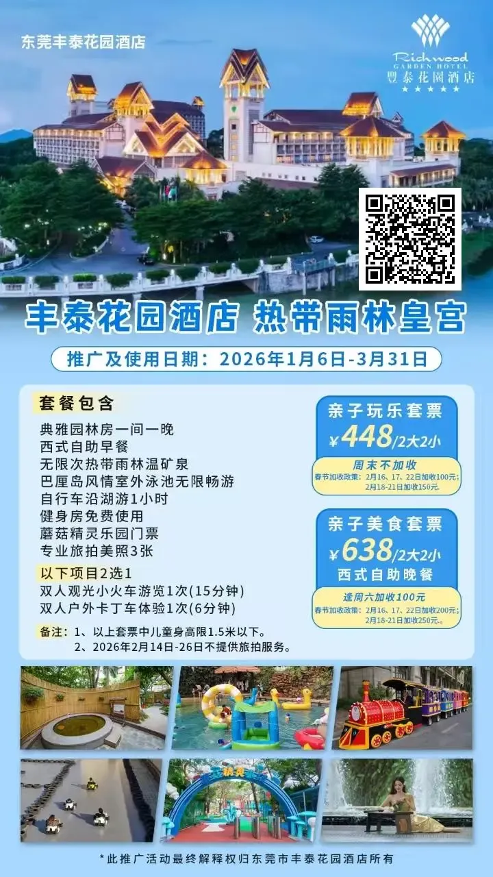 【平日周末不加收】¥448住东莞丰泰花园酒店园林房,含2大2小自助早餐+无限次温矿泉+室外泳池+精灵乐园+小火车观光/卡丁车2选1+旅拍美照~