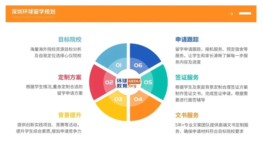 深圳环球教育提供从选校定位到文书写作,从签证办理到行前指导的全流程服务。