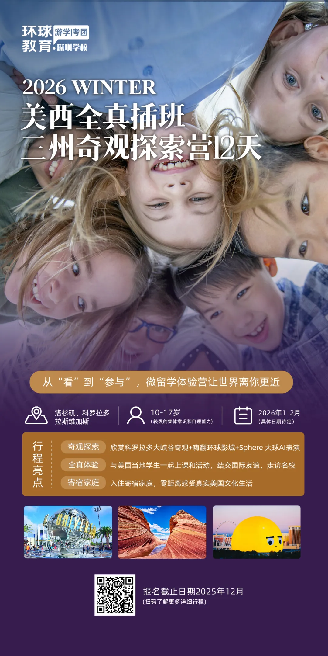 面向10~17岁,与美国当地学生一起上课和活动,走访名校,探索洛杉矶、科罗拉多拉斯维加斯城景&自然奇观。