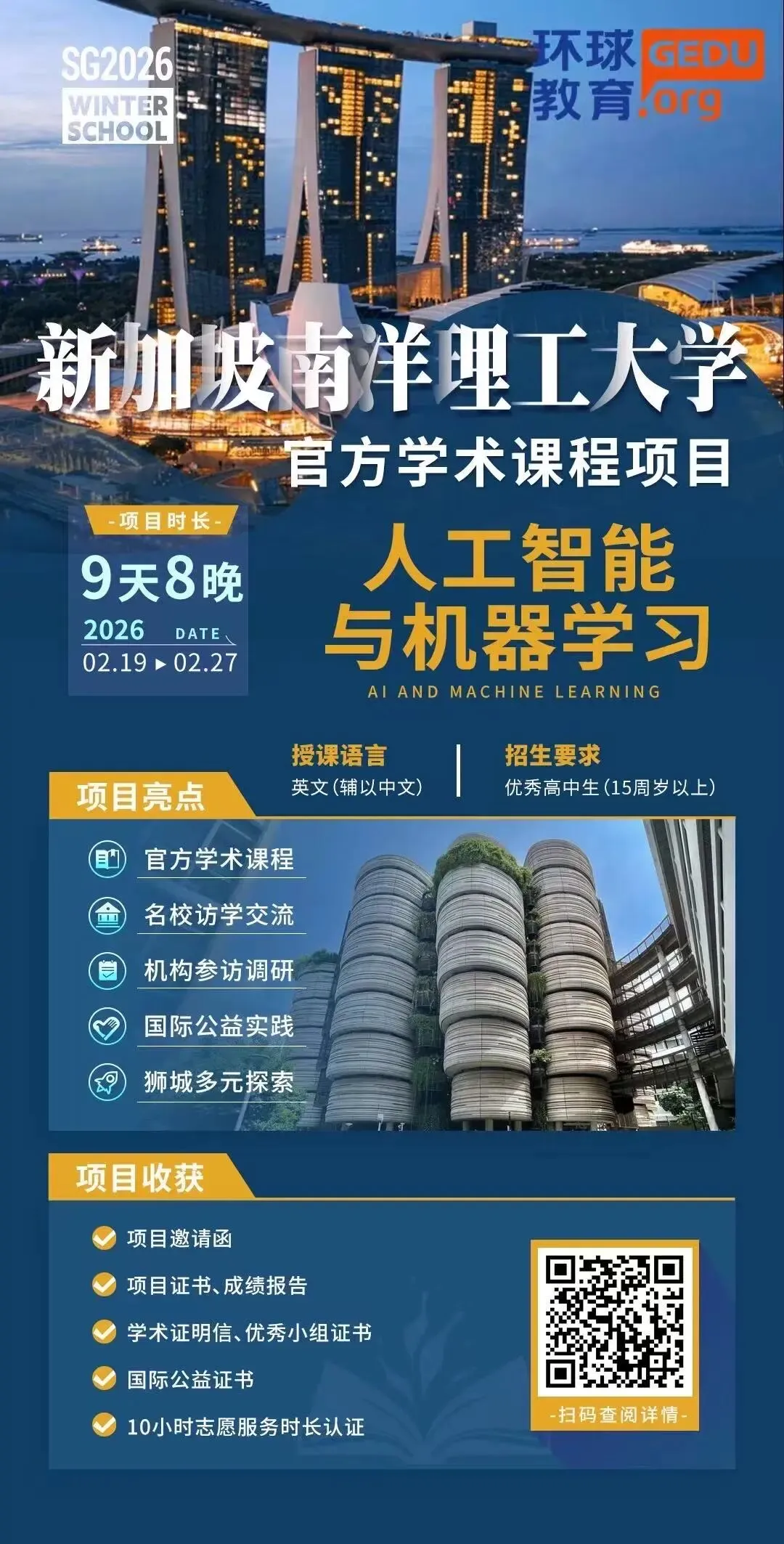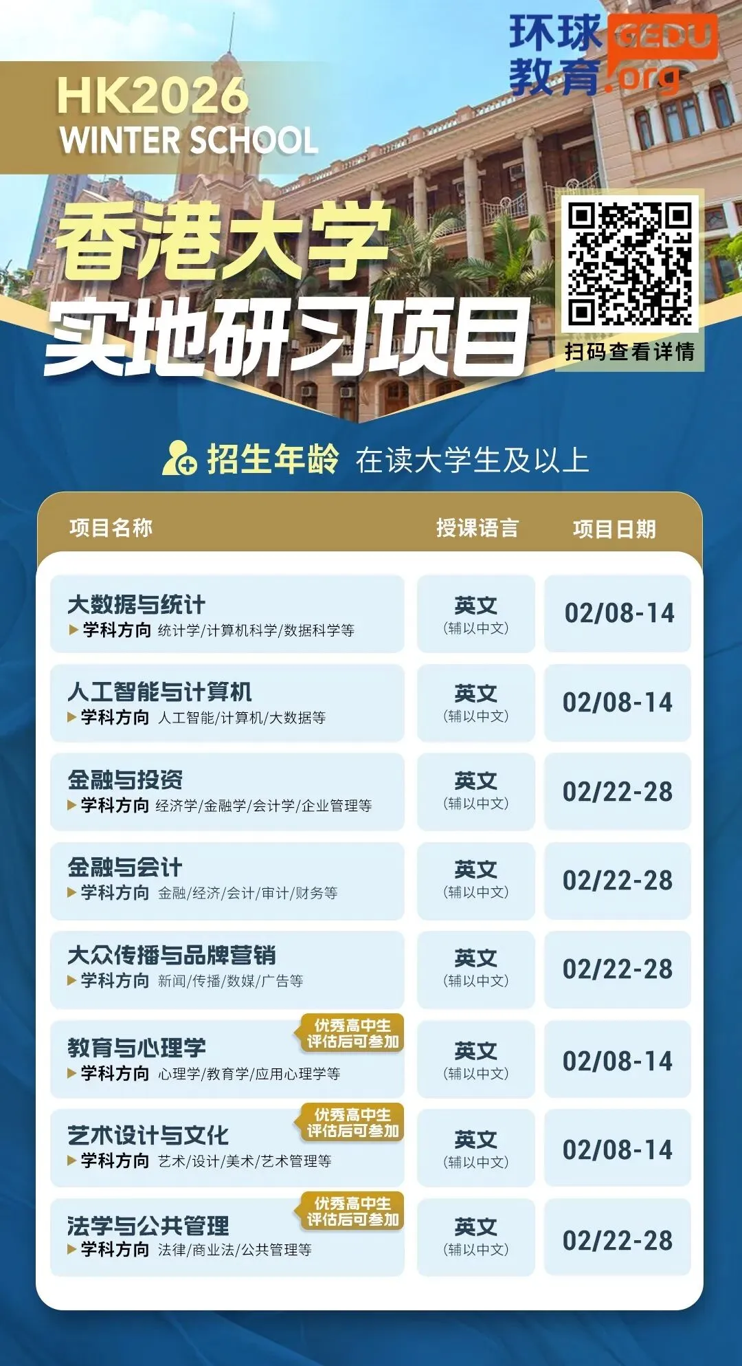 面向高中生和大学生,可选择香港大学研学或新加坡名校研学。
