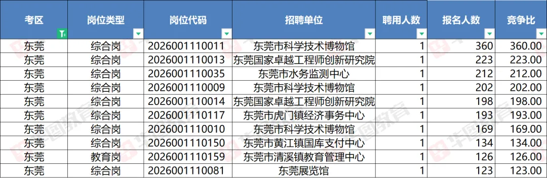 报名人数排名前十的单位中位居第一的是东莞市科学技术博物馆的科技信息咨询部,报名人数360人!