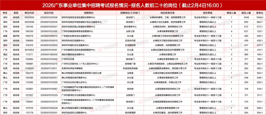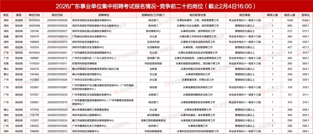 截至2月4日16时(报名期间最后一次数据),竞争比Top1岗位已突破1648:1。竞争最激烈的岗位仍集中在深圳、广州、佛山等地,前三名具体如下: