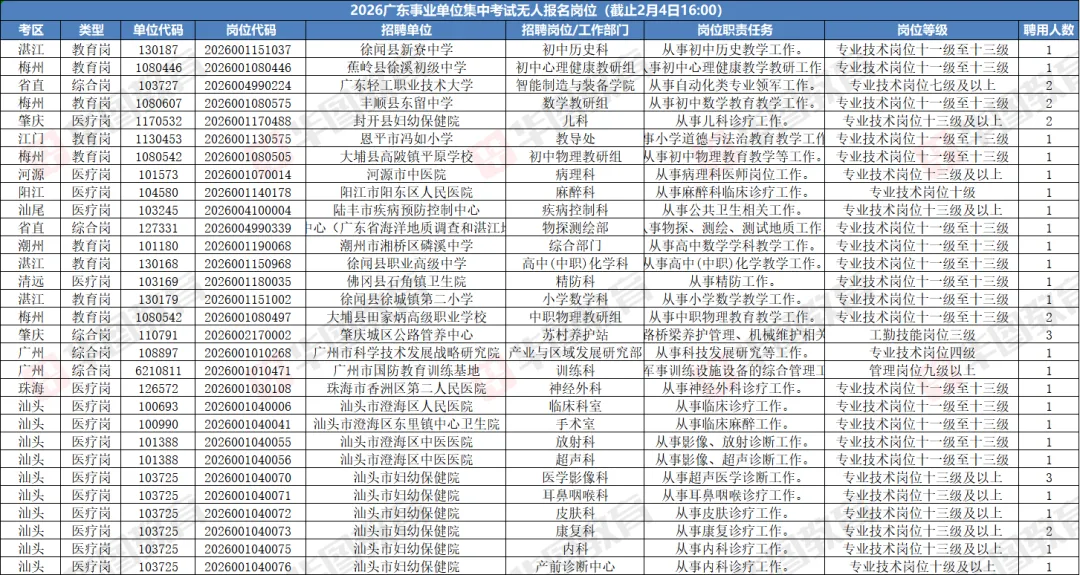 截至2月4日16时(报名期间最后一次数据),全省仍有1107个岗位无人报名,招录1284人。这些岗位广泛分布在教育、医疗、基层服务等领域,尤其集中在湛江、江门、汕头、梅州、韶关等地。