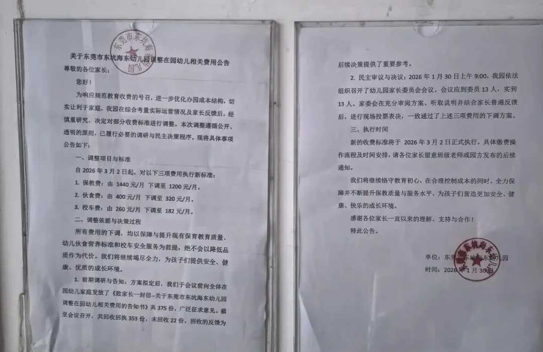 1月30日,东莞市东坑海东幼儿园发布《关于调整在园幼儿相关费用的告知书》,宣布自2026年3月2日起,全面下调保教费、伙食费及校车费三项收费标准。一、调整项目与标准
