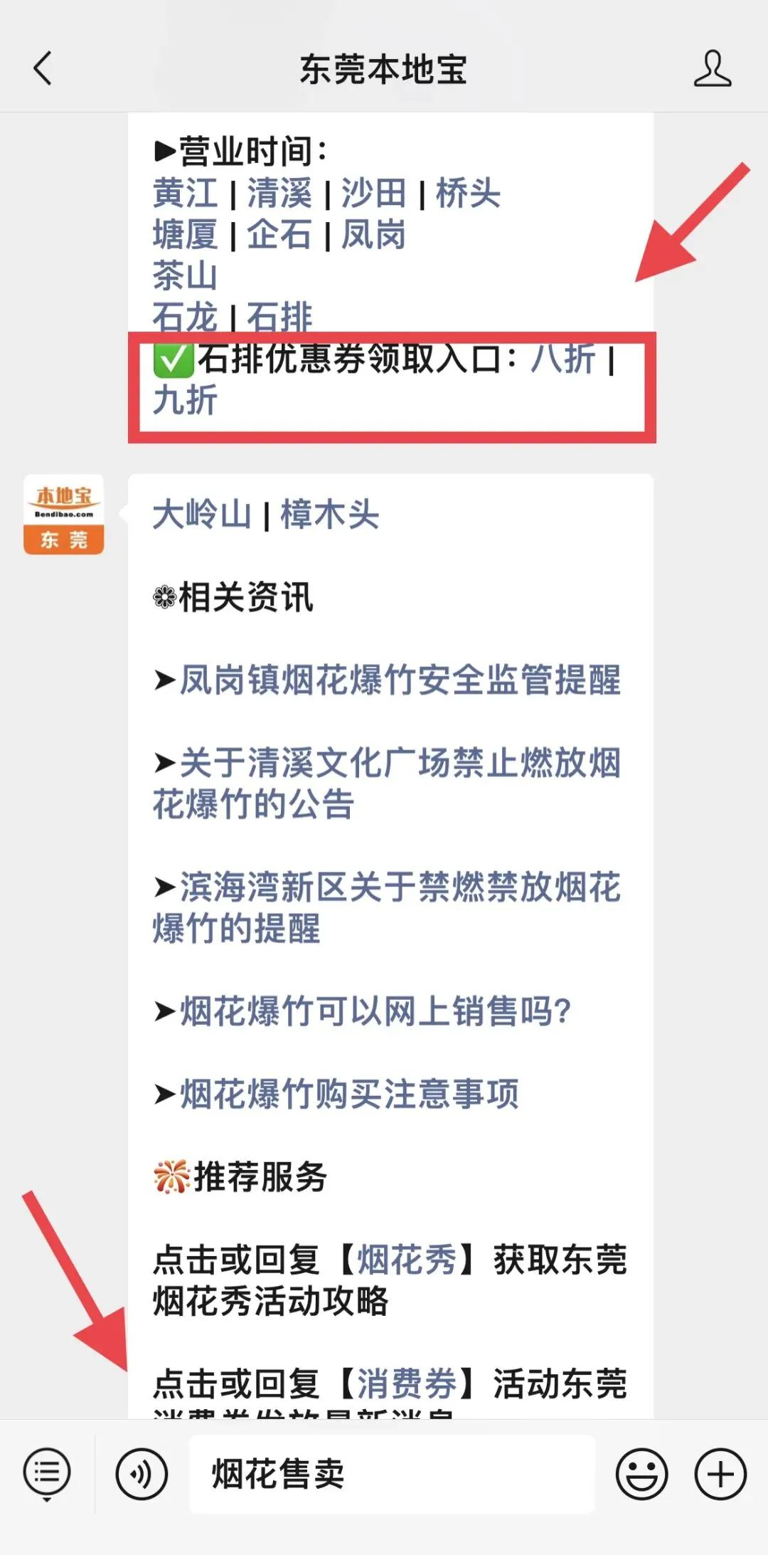 可在东江石排官微免费领取折扣券,数量有限,先到先得,长按识别下方二维码关注东莞本地宝,在聊天对话框回复【烟花售卖】,即可获取领取入口、东莞烟花爆竹燃放规定、各镇街烟花爆竹售卖点汇总!