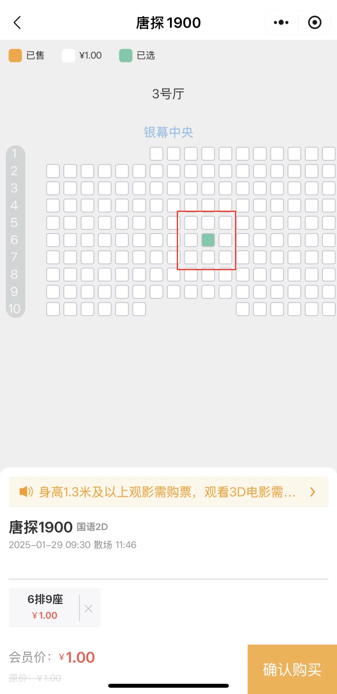 1元观影票仅适用于1、2、3号影厅