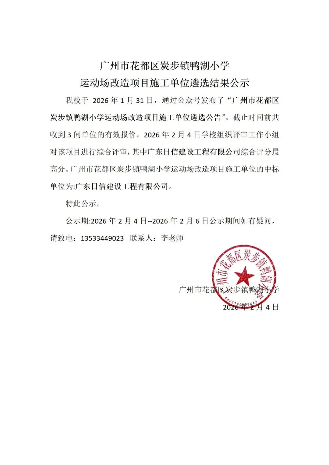 我校于 2026年1月31日,通过公众号发布了“广州市花都区炭步镇鸭湖小学运动场改造项目施工单位遴选公告”。截止时间前共收到3间单位的有效报价。2026年2月4日学校组织评审工作小组对该项目进行综合评审,其中广东日信建设工程有限公司综合评分最高分。广州市花都区炭步镇鸭湖小学运动场改造项目施工单位的中标单位为:广东日信建设工程有限公司。