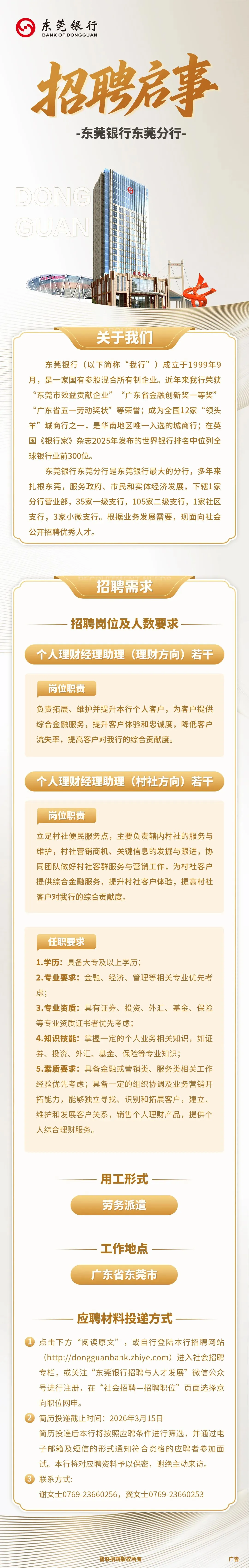 【东莞招聘】银行相关工作!大专起报,东莞银行东莞分行招聘启事
