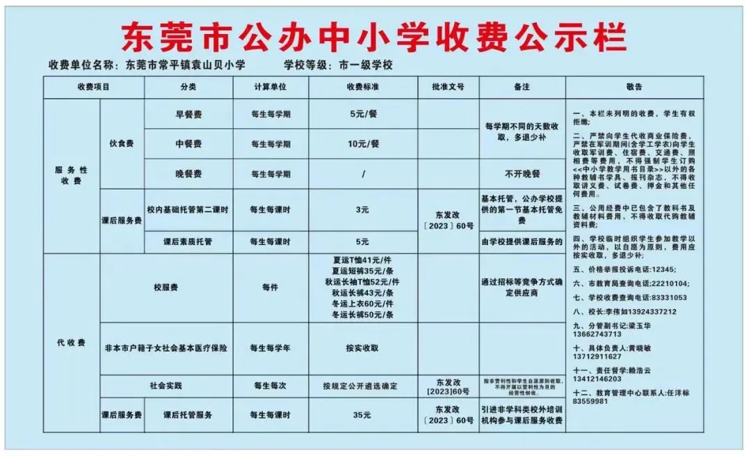 根据东莞市教育局《关于加强学校教育收费公示管理工作的通知》精神,现将东莞市常平镇袁山贝小学收费公示如下: