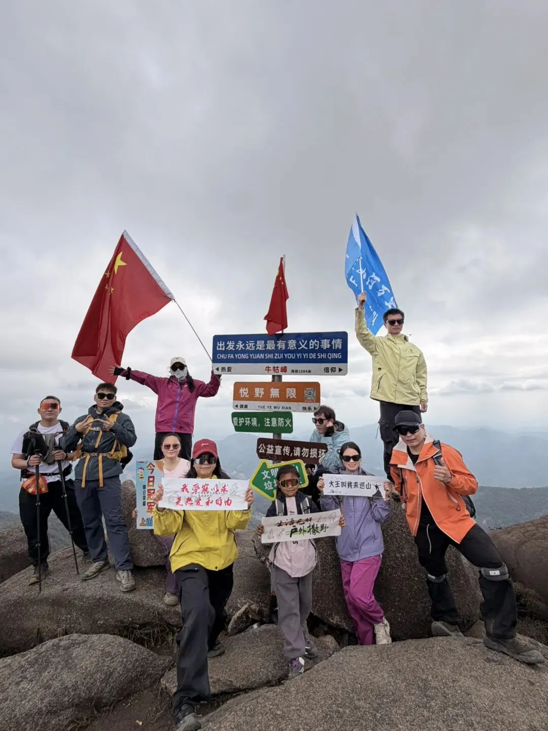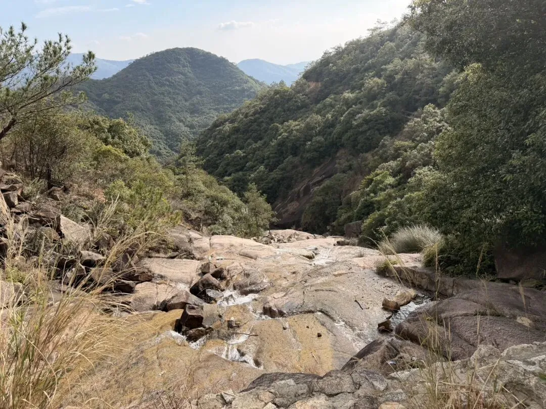 穿过竹林,翻过山头,大约600米处就来了小猪兜水库,这里可以稍作休息,欣赏美景,全程没有补给点需自备食物水源。接下来还是翻阿翻,爬阿爬,大约一小时就可以在大石头拍照打卡啦~坐在山头视野365度无死角仰望欣赏,去的地方越多,越知道自己更喜欢哪里,山水几万重,历历皆是缘。最后一段上升路线直达1084米,一首歌(麒麟)送给大家,我要带上我的旗帜我的奖章,带上我的兄弟们在山顶上面摆造型,我要比你看到过的听到的过那些花里胡哨加在一起还要顶!山顶打卡完后全程就是下坡路线了,路径大猪兜水库,这里风景如画。我们选的是经典环线约12公里,下山的路程四周满山遍野,还能听见小瀑布的流水声最后恭喜你,来到了下山必经之路,大约2公里的夺命大水管,注意⚠️侧着下台阶可以缓解膝盖疼,部分路线较滑,一定要用登山杖减轻重力。好了就到这里了,热烈欢迎您再来登山喔!