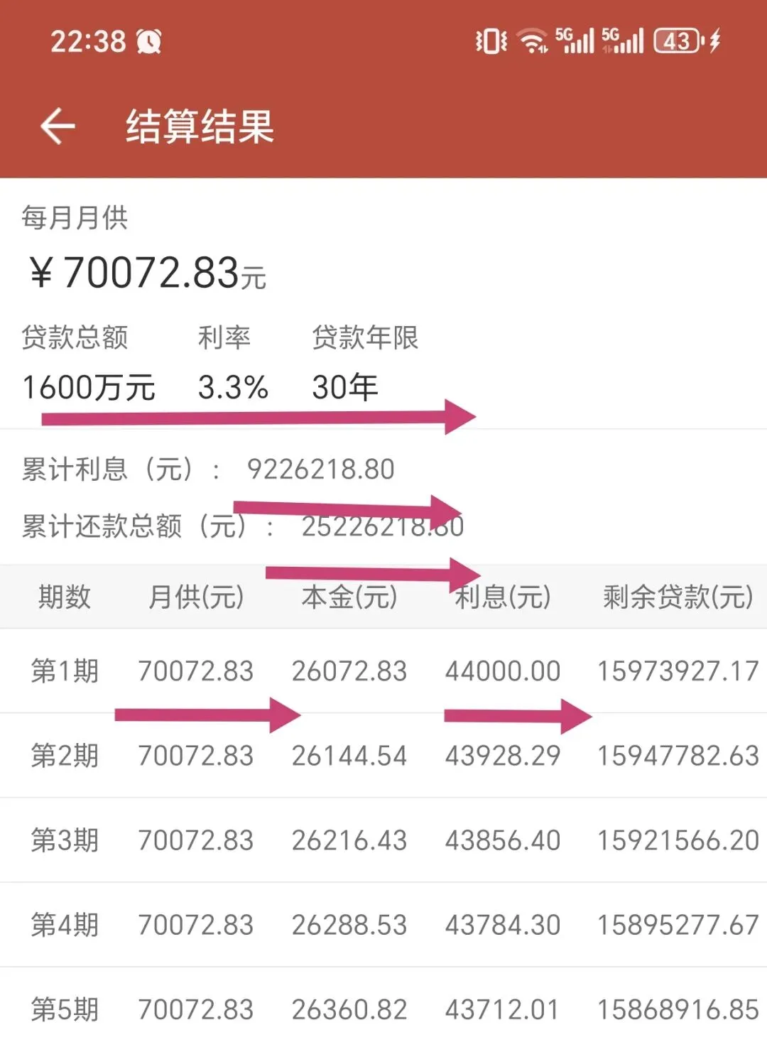 特别是针对豪宅区业主,🈚️论首套还是2套,太多人选择此方法了。以2000万房产为例。假如按首付2成算,首付400万,按揭1600万,30年月供70000元/月供。按揭如图: