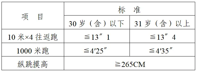 体能测评包括三个项目,分别为纵跳摸高、10米×4往返跑、1000米跑,每个项目测试次数不超过2次。体能测评采用达标制,任意一项不达标的,即为体能测评不合格,不进入下一环节。体能测评不设缓测、补测,达标标准详见下表。