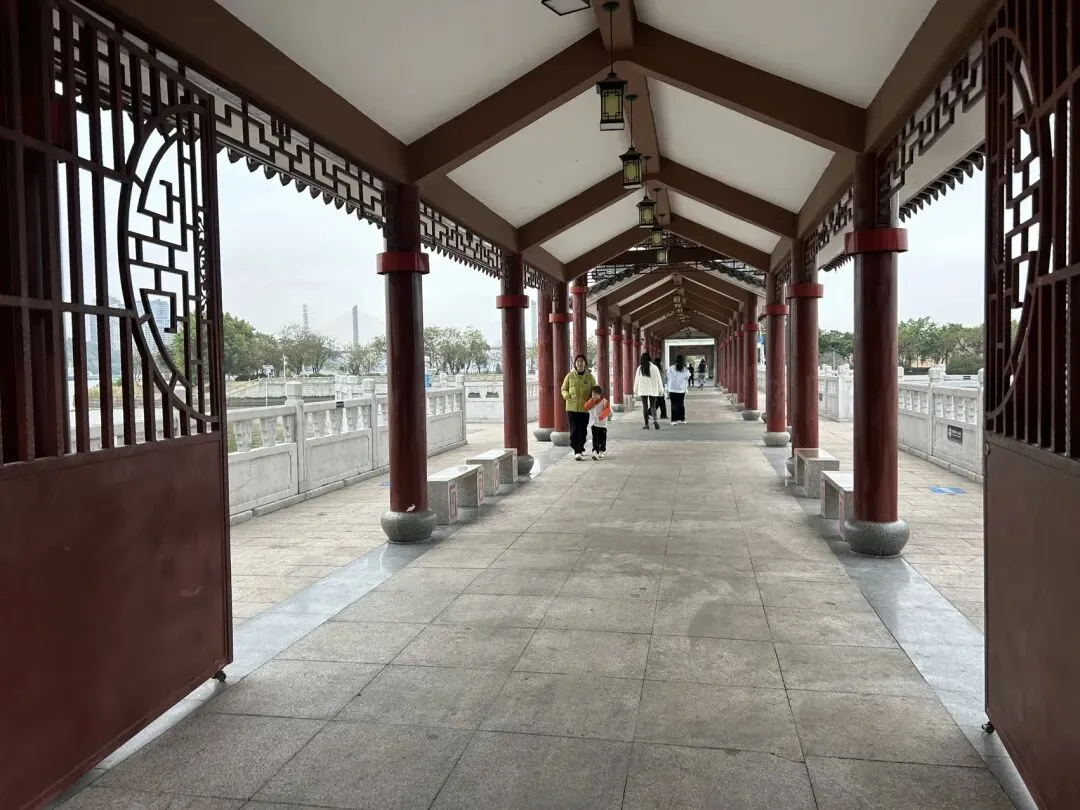 登上古色古香的游廊,可以远眺珠江口岸穿梭的轮船,还可以近观各式豪华游艇。倘若走到廊桥的深井一侧,你甚至能深入岸堤江边走上登船浮桥,尽览游艇内部的精美之处。交通贴士: