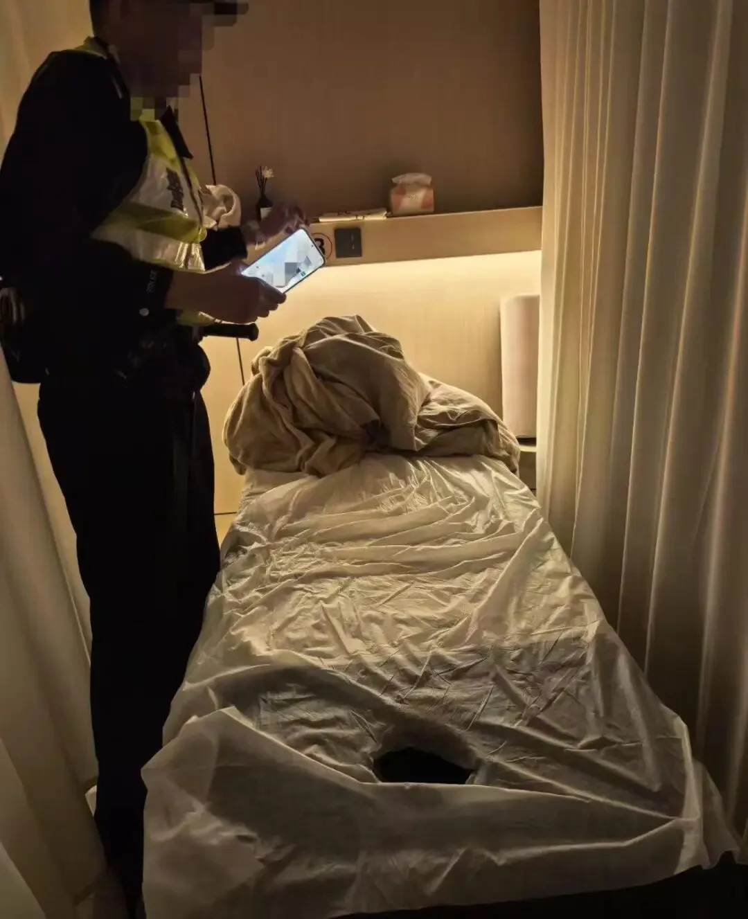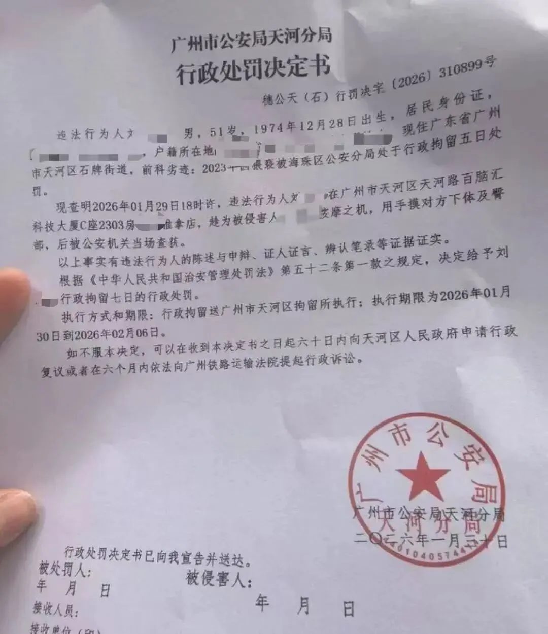 根据该消费者发布的广州市公安局天河分局行政处罚决定书,涉事员工刘某某今年51岁,1月29日18时许,该员工在为顾客按摩之际用手摸对方下体及臀部,后被公安机关当场查获。